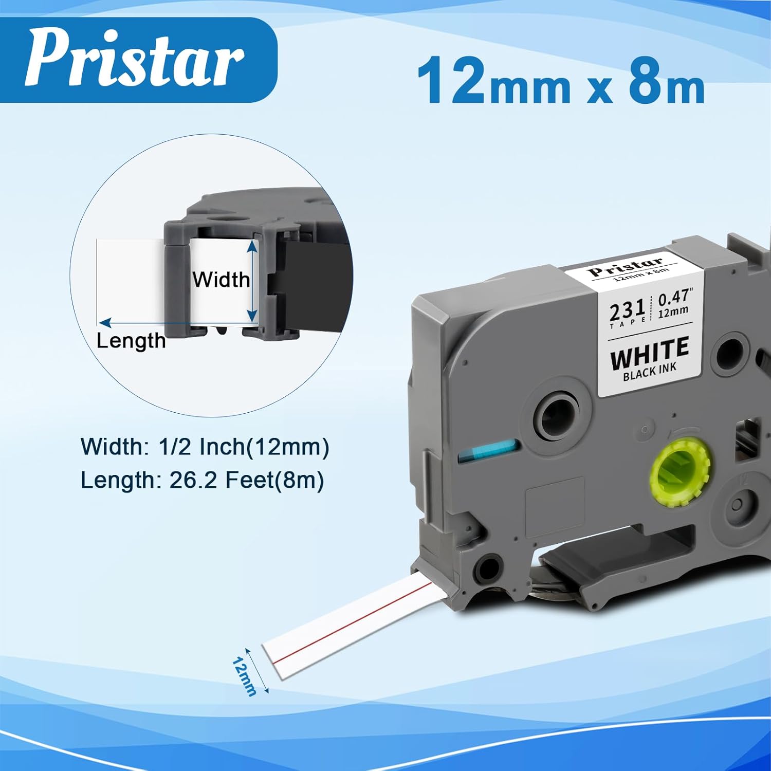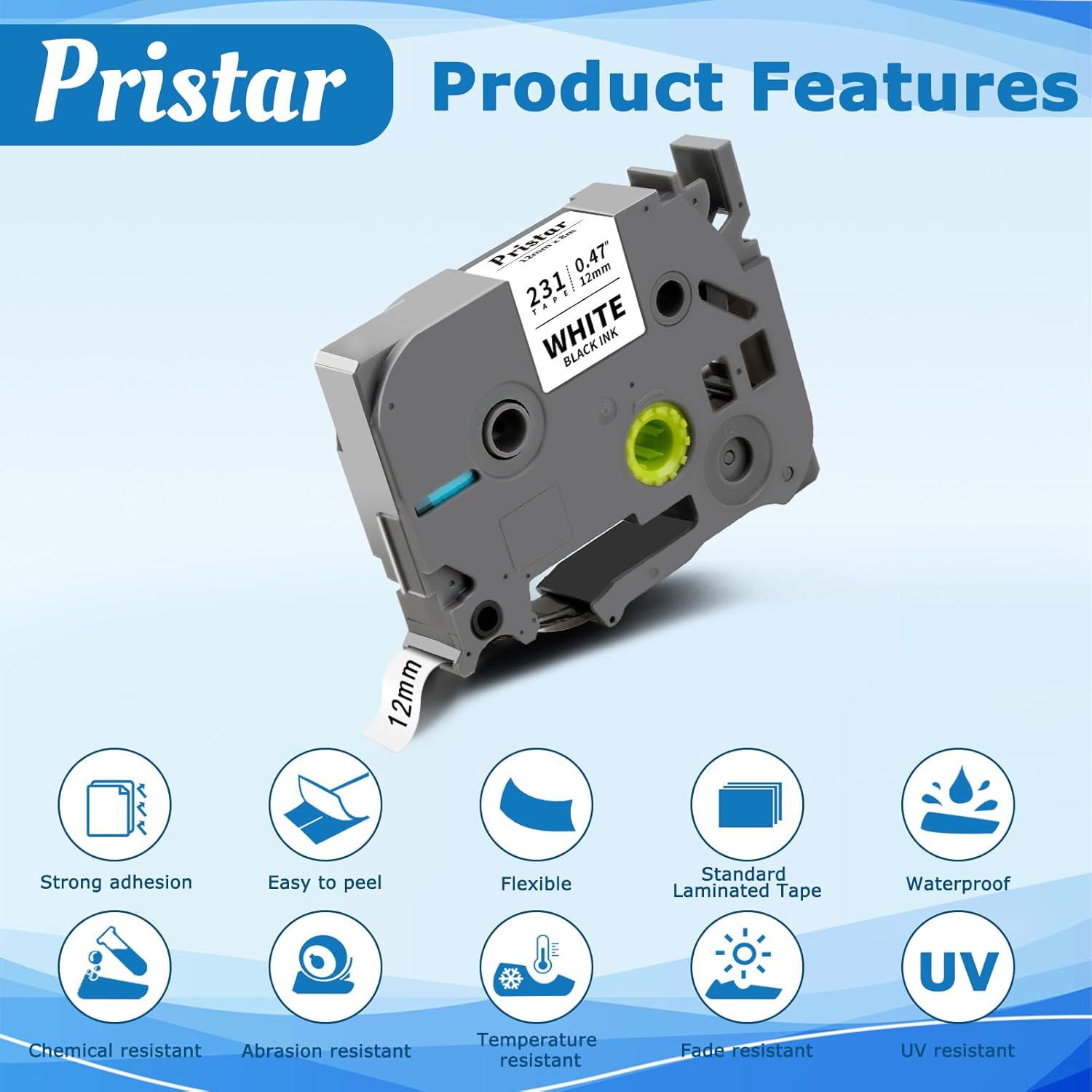 - Tz tape 12mm 0.47 inch laminated for Indoor and outdoor use. Normally used in office, factory, school, hospital, home, etc. Such as labeling folders, household products, components, electronic parts, power switch, etc. Pristar label tapes organize your workplace perfectly and make your work more efficient