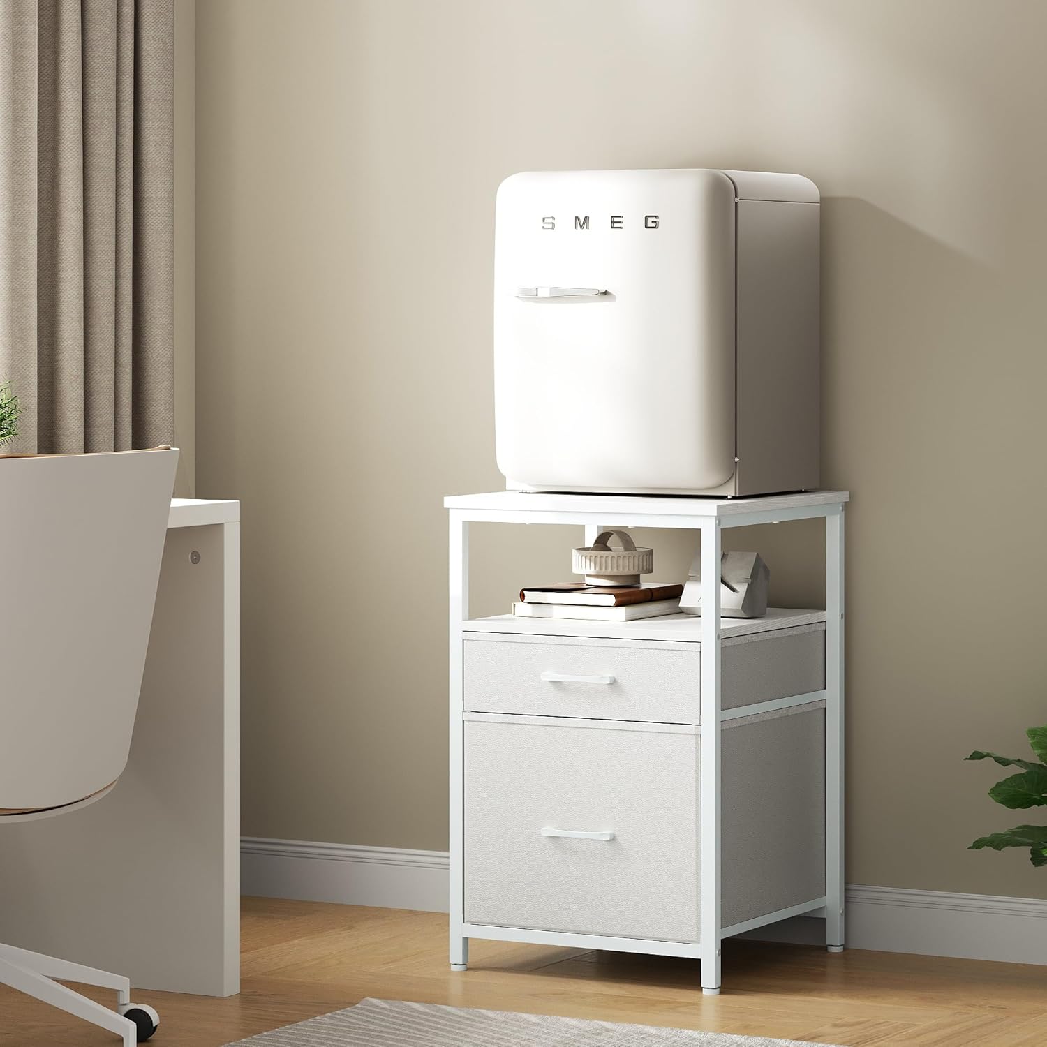 - Three-Tier Storage Design - This mini fridge stand features two fabric drawers (NOT WOOD) and one compartment, offering a total of three storage spaces to perfectly meet your various storage needs. It’s not just a mini fridge stand with storage; it’s also a great mini fridge organizer, helping you easily keep items around your fridge tidy and organized.
