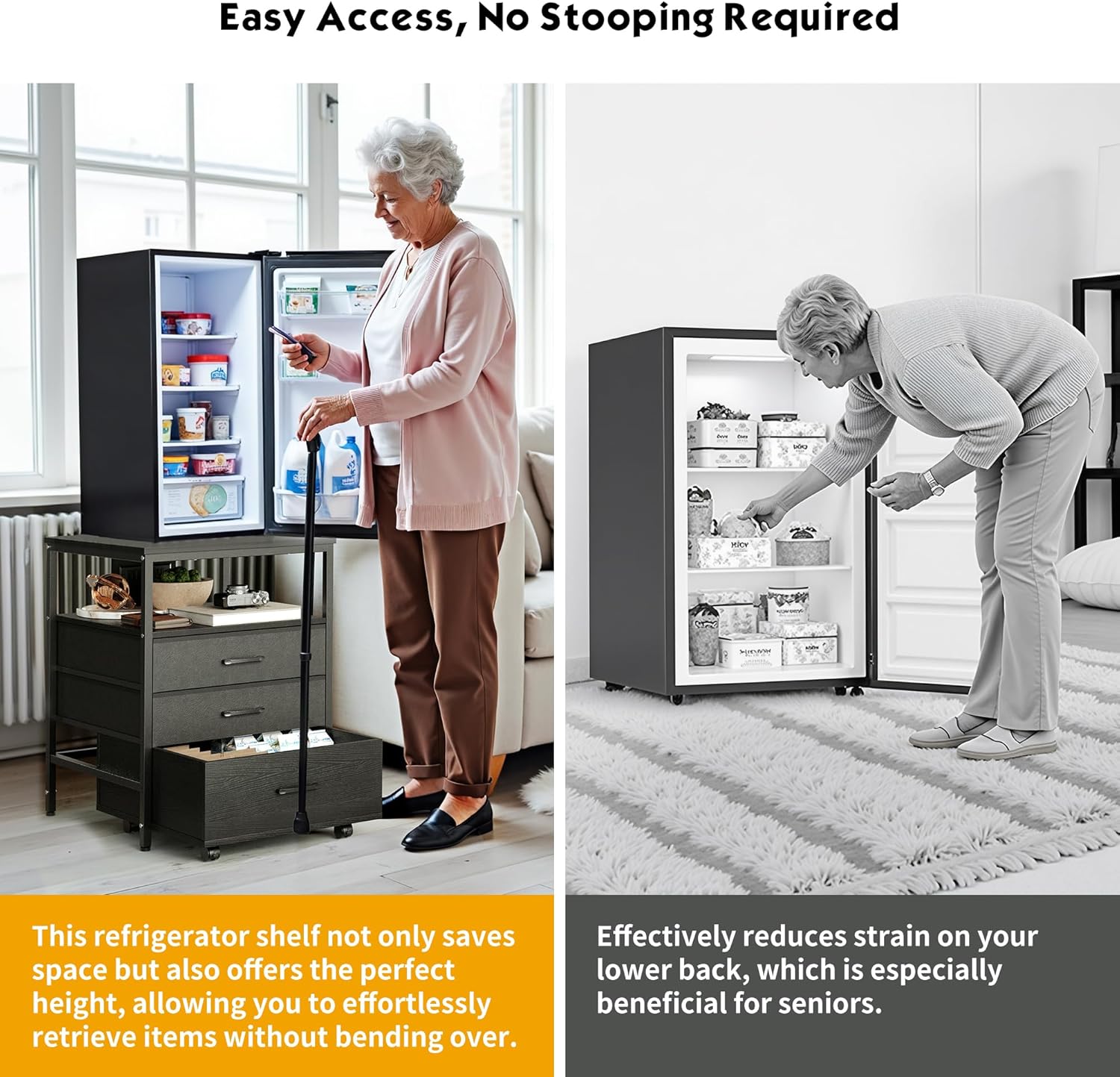 - Grab Items with Ease - This mini fridge stand is designed to reduce strain on your back and lower back, making it especially suitable for seniors. By elevating your fridge, you'll no longer need to bend over frequently to access items, making everyday use more comfortable and convenient.