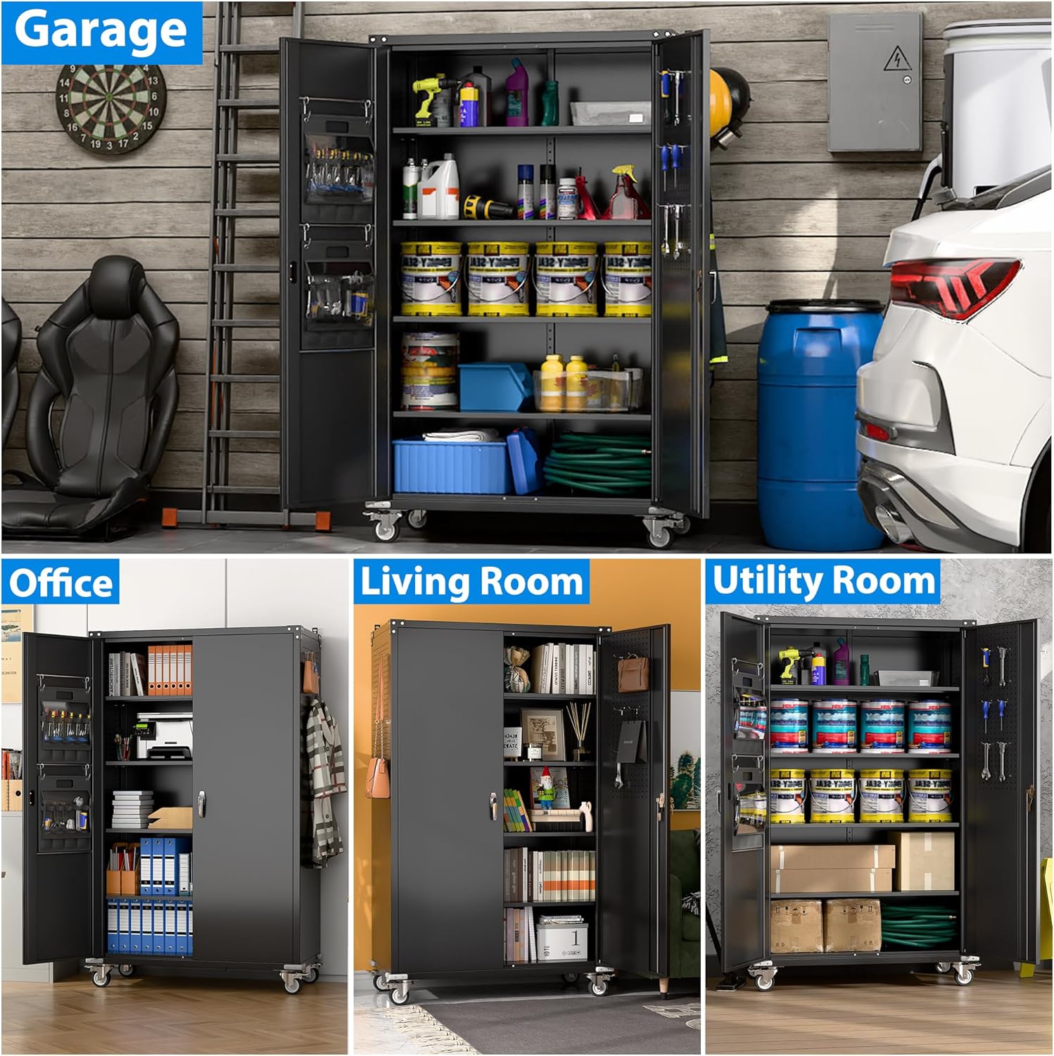 - [Garage&Home Storage Cabinet] Plenty of storage. "great garage cleanup".You can move them around as needed and the casters and wheels work great on all the different surfaces in your garage. Extra storage strong and fit your needs, it is sufficient for garage use. If your house literally has NO closets on the 1st, floor. you needed this metal storage cabinet for your board games, cases of water,as well as miscellaneous items. Rolls easily which is great when moving to a new home.