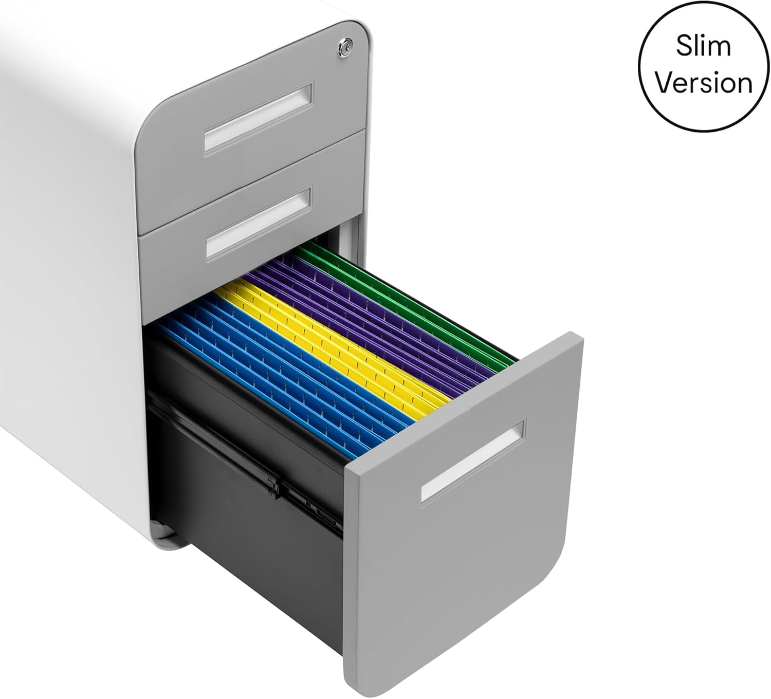 Laura Davidson Furniture Stockpile Slim 3-Drawer Mobile File Cabinet with Lock - Under Desk Metal Filing Cabinet, Legal/Letter File Folders, Wheels & Stationary Feet, Assembled, Light Grey Faceplate