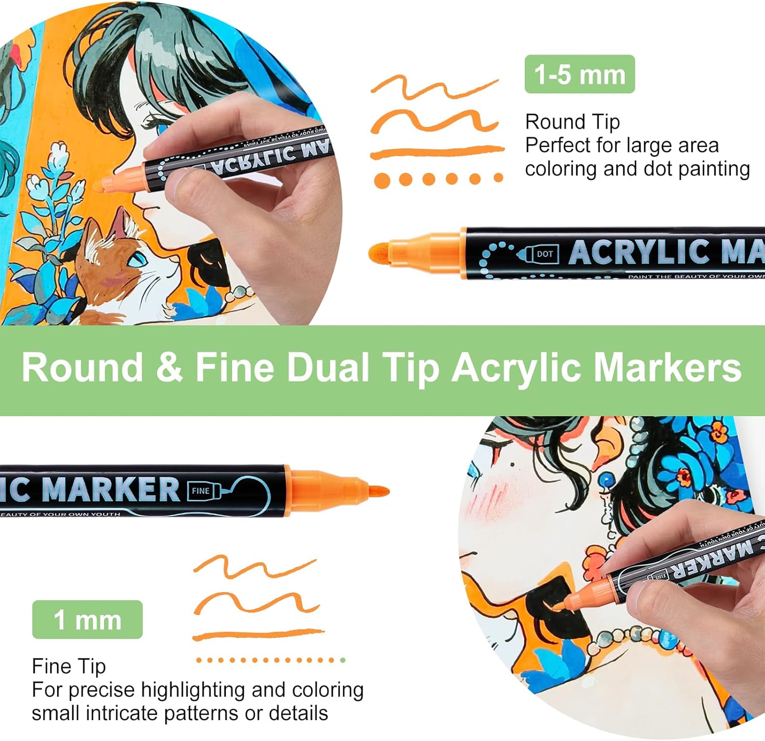 - High Quality Dual-Tip: Each acrylic paint marker features two wear-resistant fiber nibs to meet different coloring needs, eliminating the hassle of switching nibs and offering greater convenience for your creations. The 1-5mm round tip is ideal for painting large areas, while the 1mm fine tip is perfect for outlining and fine-line work. Whether you're a beginner or a professional, you can fully unleash your creativity!