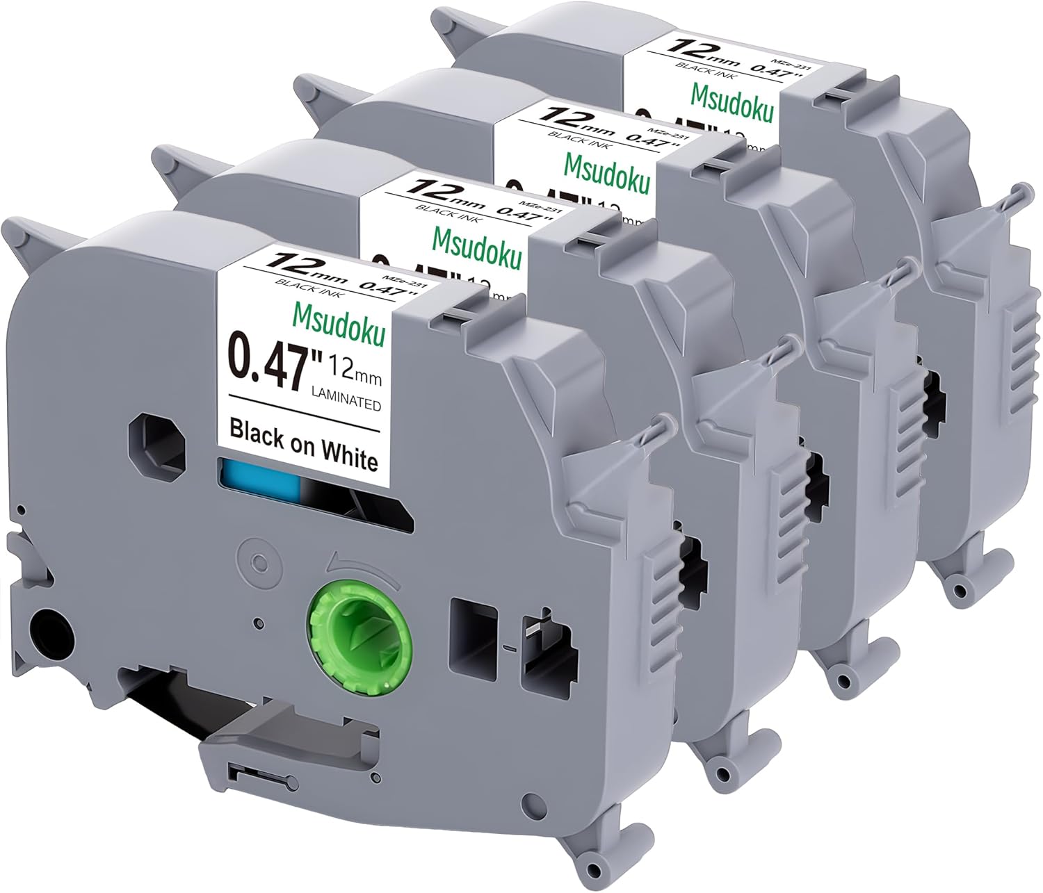 Tze TZ Tape 12mm 0.47 Laminated White Tape Compatible for Brother Label Maker Tape 12mm 1/2" Black on White Tape for Ptouch PT PTD200 PTD410 D210 D220 D610 P710BT PTH110, 4-Pack