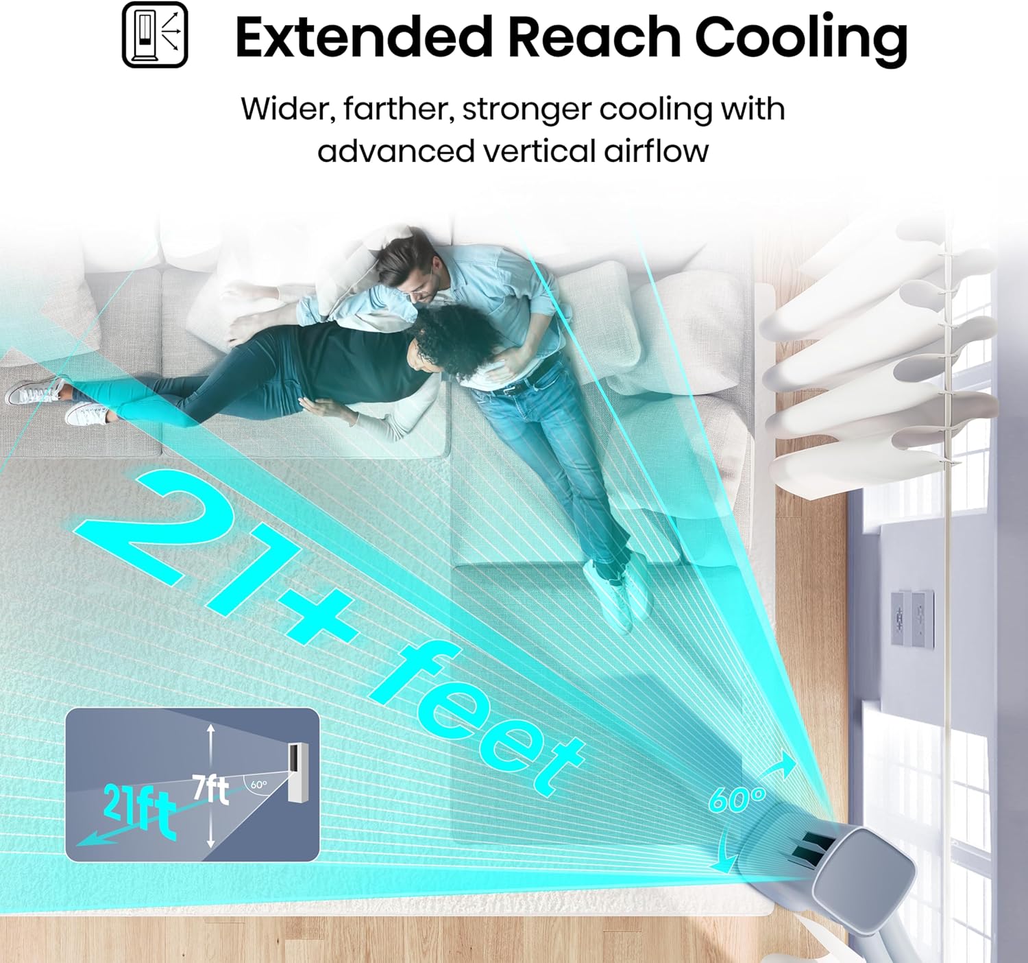 - Extended Reach Cooling – A high-performance vertical cross-flow fan propels cool air up to 21 feet with a 60-degree wide coverage, ensuring rapid and even cooling across larger spaces.