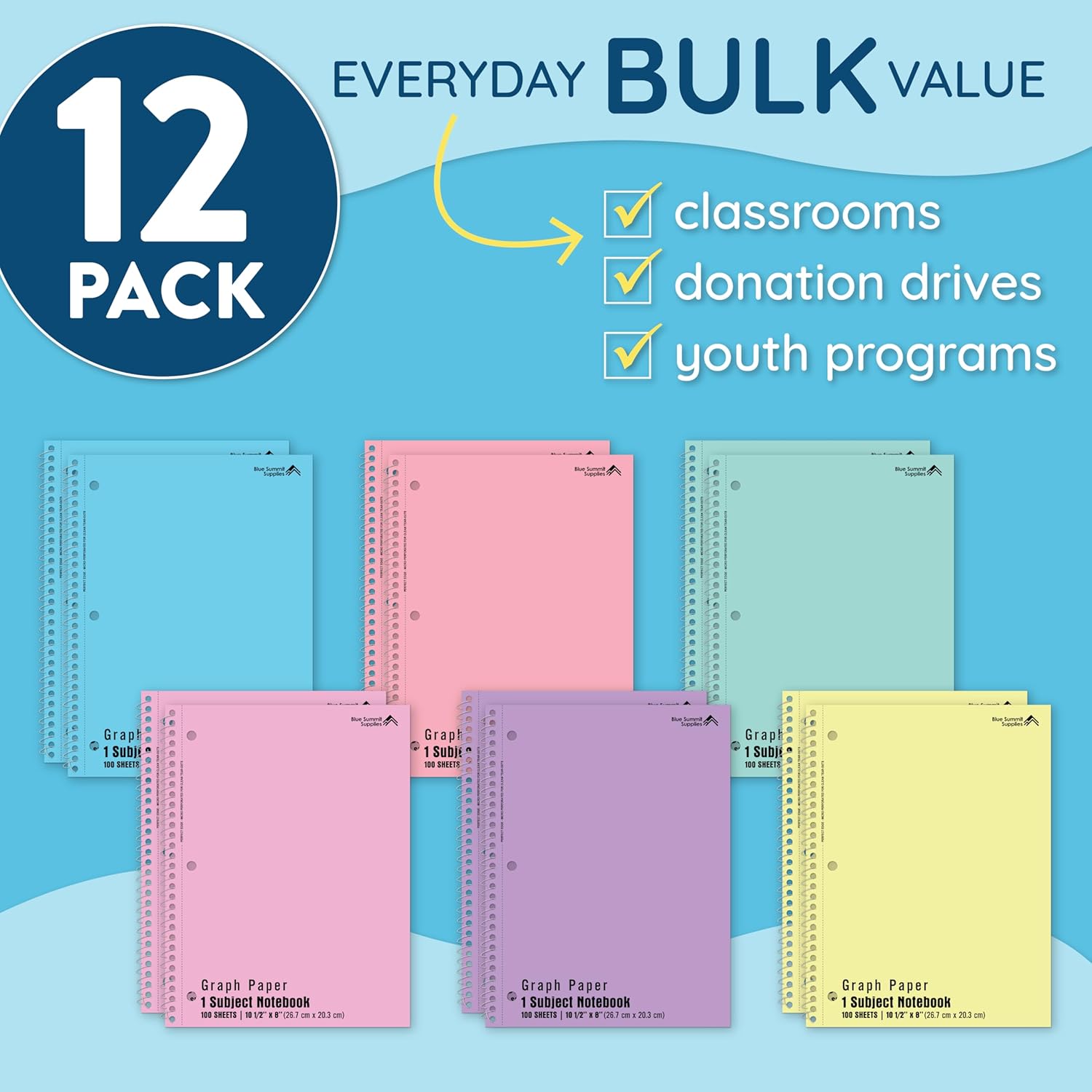 Blue Summit Pastel Graph Paper Spiral Notebook, Cute Spiral Graph 8x10.5, Square Grid Notebook for Math, College, Work, School, and Lab, Graphing Paper, 70 sheets, 12 Pack
