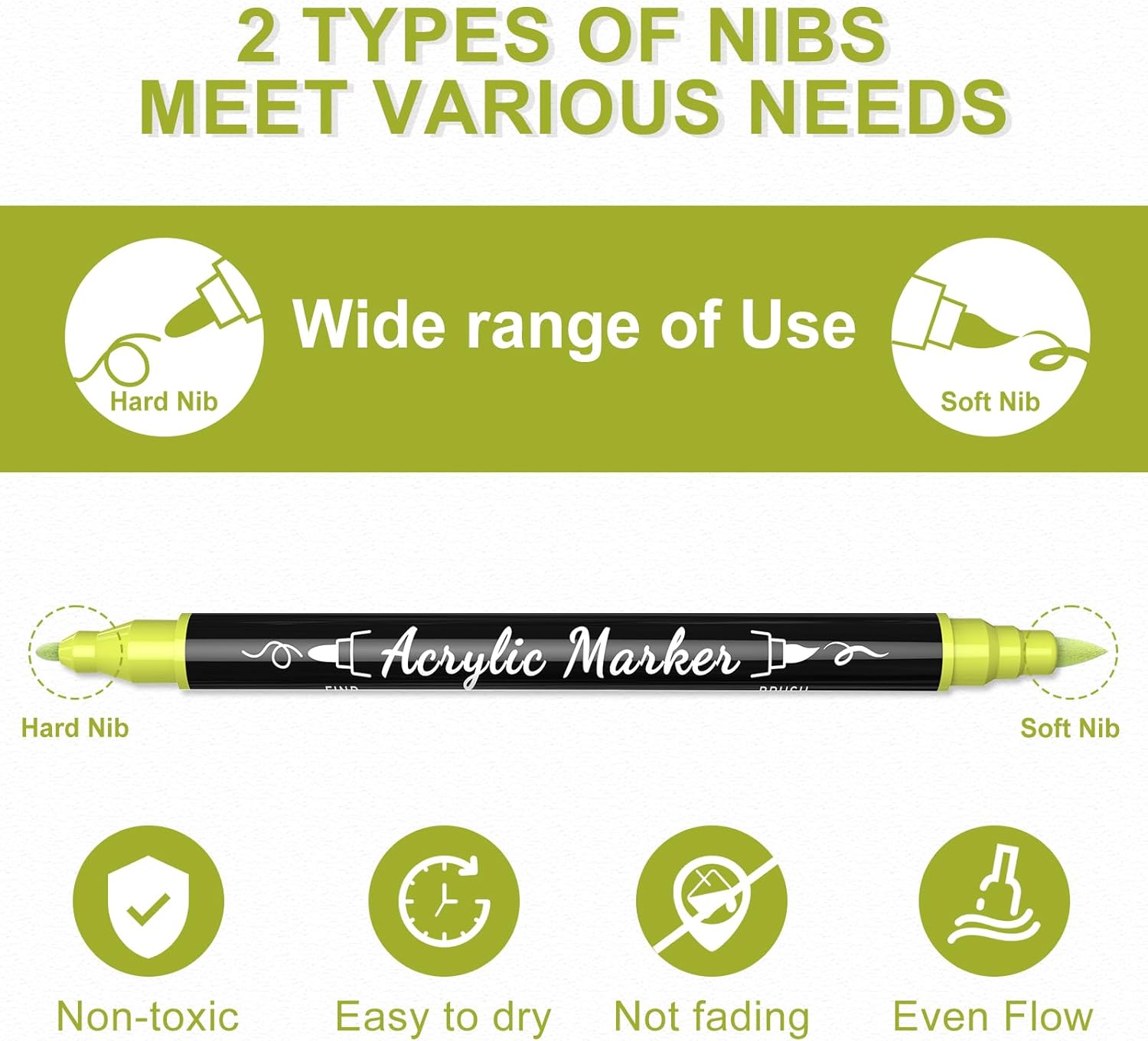 - Versatile Dual Tip: Our acrylic paint markers feature a unique dual-tip design to meet various needs. The 1mm fine tip is perfect for outlining and adding intricate details, while the 1-5mm brush tip is designed for covering large areas.By adjusting brush pressure, you can create different strokes without the hassle of changing nibs, making your creative process more convenient. Whether you're a beginner or a professional, you can fully unleash your creativity!