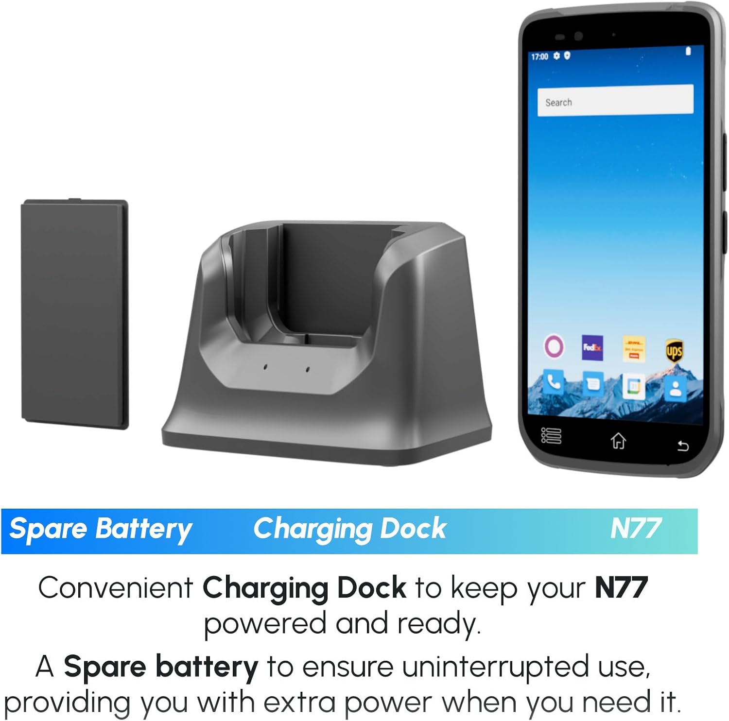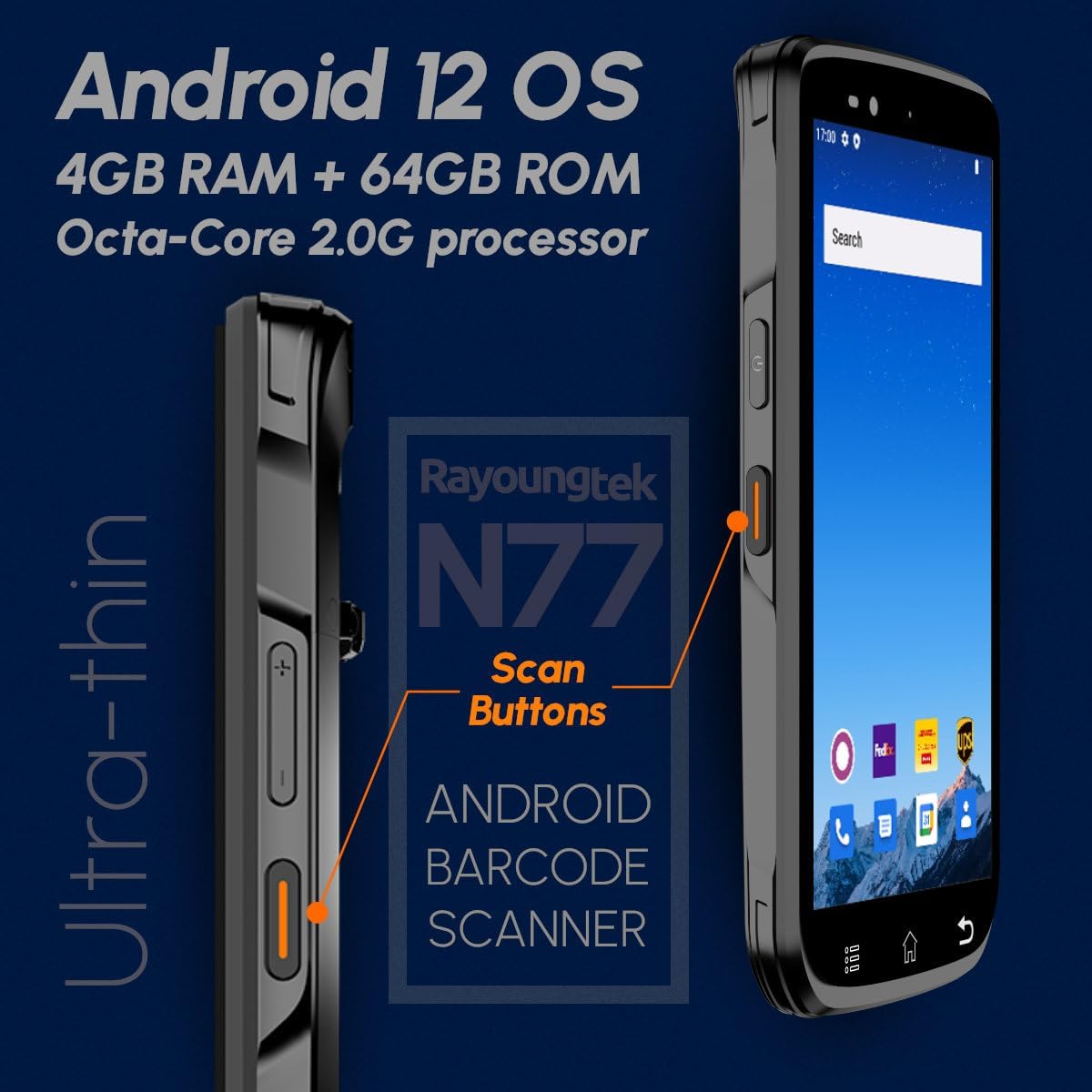 - 「Operates Smoothly」Running on the Android 12 operating system, equipped with 4GB RAM + 64GB ROM, powered by an Octa-Core 2.0G processor, and showcasing a 6.0-inch IPS touch screen. The N77 Android Barcode Scanner configuration ensures a smooth and user-friendly experience. Supports installation of Android-based ERP, WMS apps, or web-based mobile applications.