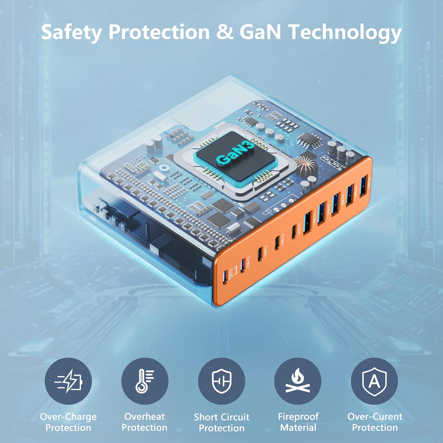 320W USB C Charger Block, 10-Port USB C Charging Station GaN III PD 65W Laptop Fast Charger Adapter for MacBook Pro/Air, DELL, iPad, iPhone, Samsung Galaxy (Orange)