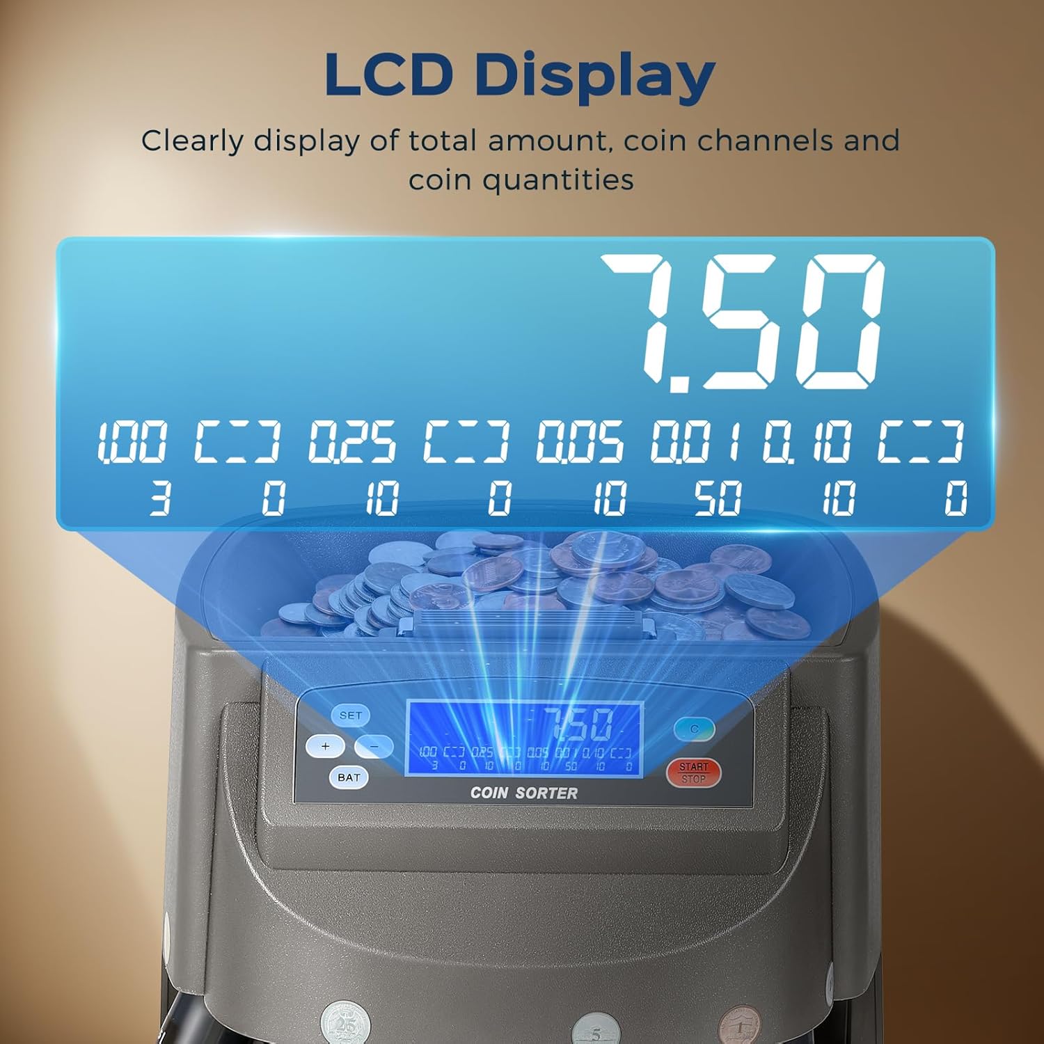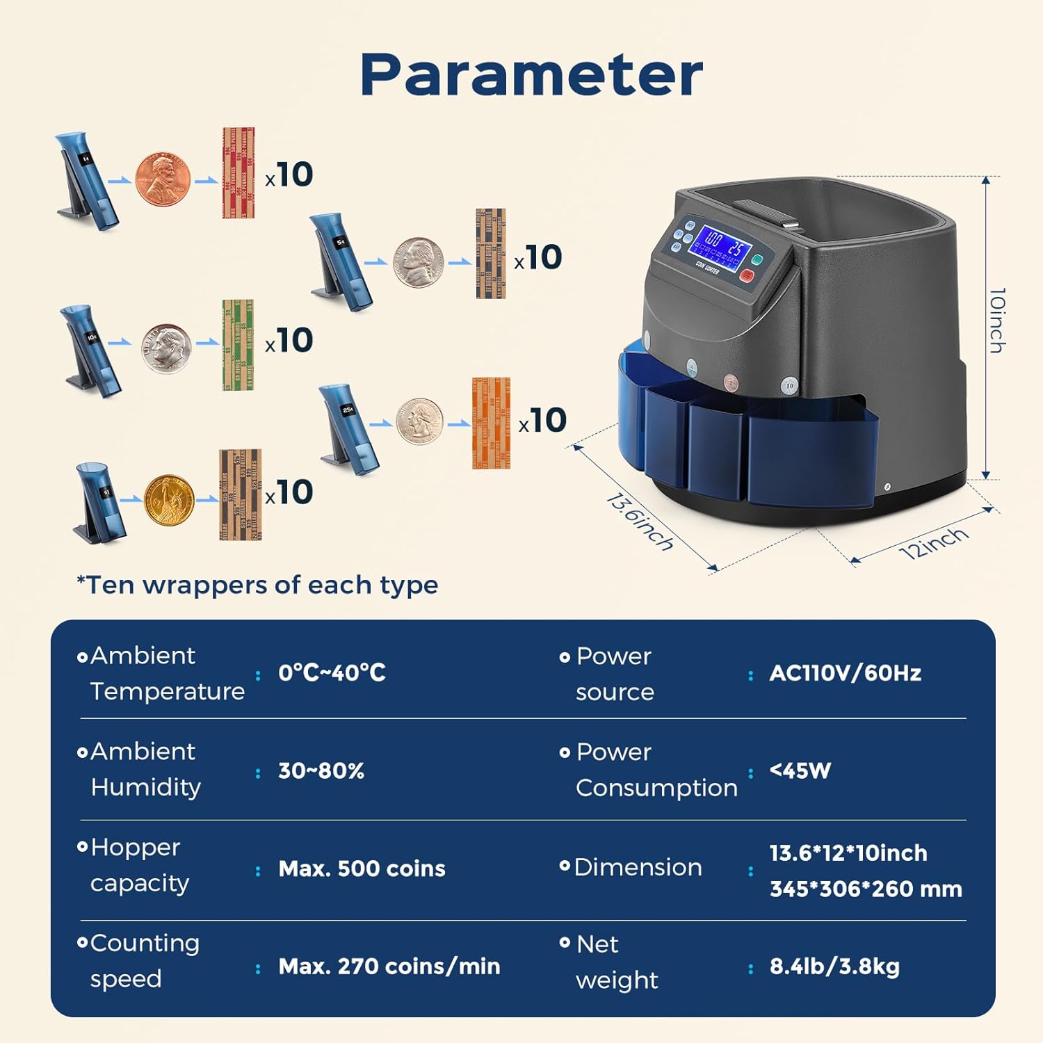 - Efficient operation: The hopper has a capacity of 500 coins and a sorting speed of 270 coins per minute, and is equipped with a backlit LCD screen to display the total count and the count for each denomination.