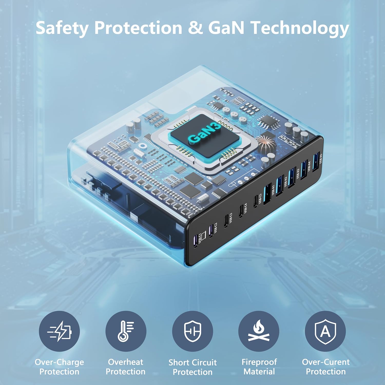- Multiport USB-C & A Charging Station: Boasting to charge up to 10 devices at once, this versatile charging block features 5 USB-C ports and 5 USB-A ports. The dedicated USB-C port powers newer electronics like laptops, while the legacy USB-A ports support older devices. Unlike most chargers with false advertising and outputs that slow down when multiple ports are used.