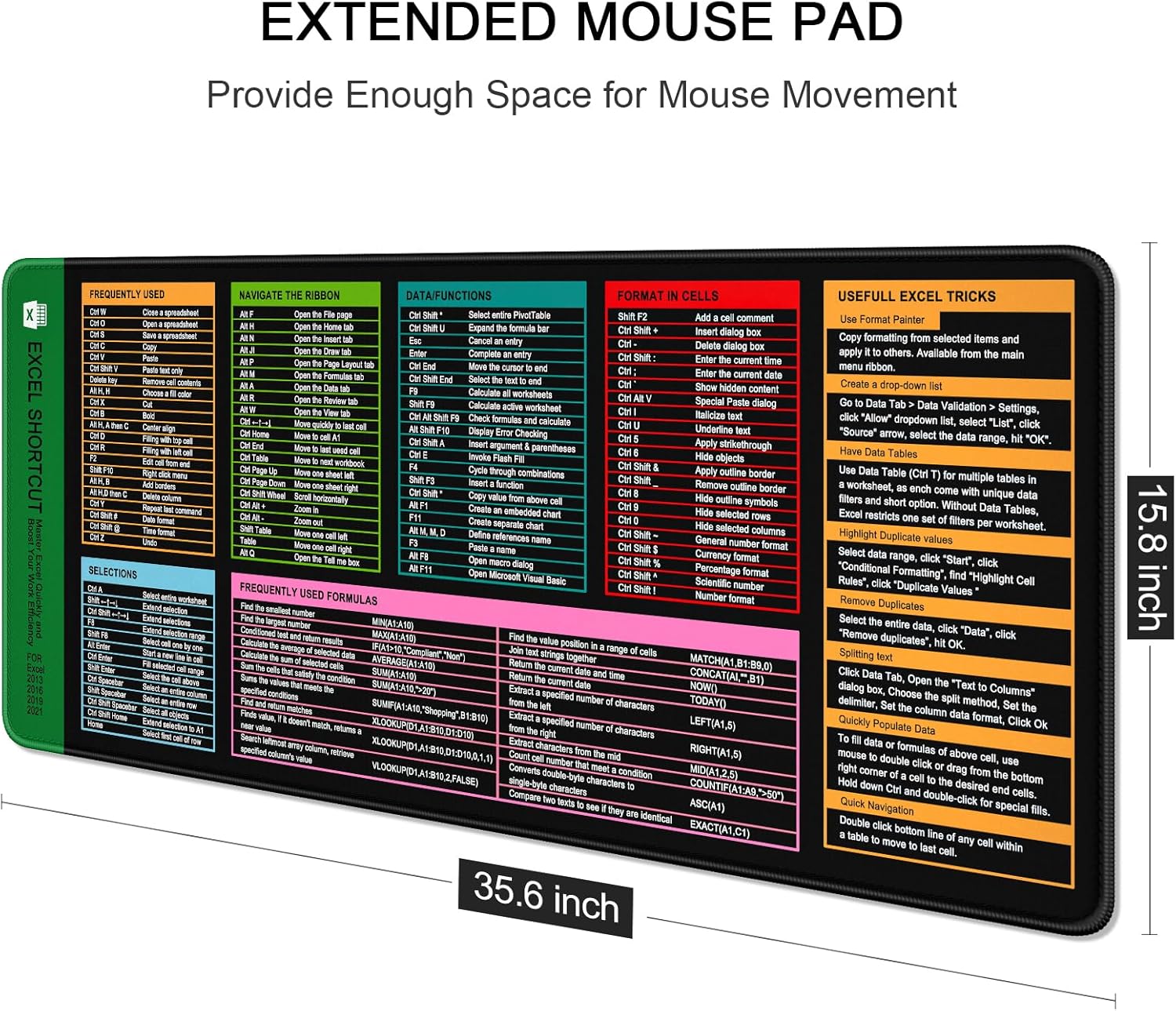 Auhoahsil Large Mouse Pad, XXL Gaming Mousepad, Desk Mat for Desktop, Thick Rubber, Big & Long Size, Stitched Edges, Full Desk Pad for Laptop & Computer, Extended 35.4 x 15.7 in, 01-Excel Shortcut