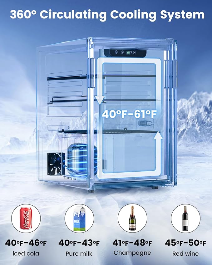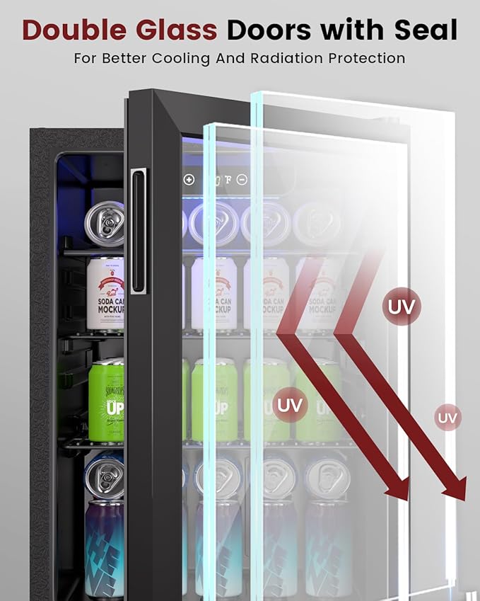 - Stylish & Practical Wine Cooler - The Feelfunn beverage refrigerator features a double-layer glass door with a sealing strip, designed to prevent cold air from escaping and keep warm air out. The stylish design complements any room decor, from modern kitchens to cozy man caves. The 360° circulating duct cooling system ensures every bottle or can stays evenly chilled.