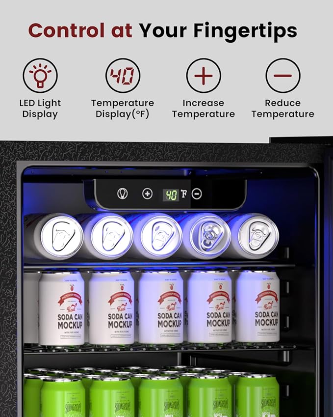 - Precision Cooling with Easy Touch Control - Easily adjust the temperature of this wine cooler refrigerator using its intuitive touch panel. With a range from 40°F to 61°F, this small wine fridge ensures your wines, beers, and sodas are served at the perfect temperature. The elegant blue LED light makes it easy to find your favorite beverage even in low-light settings.