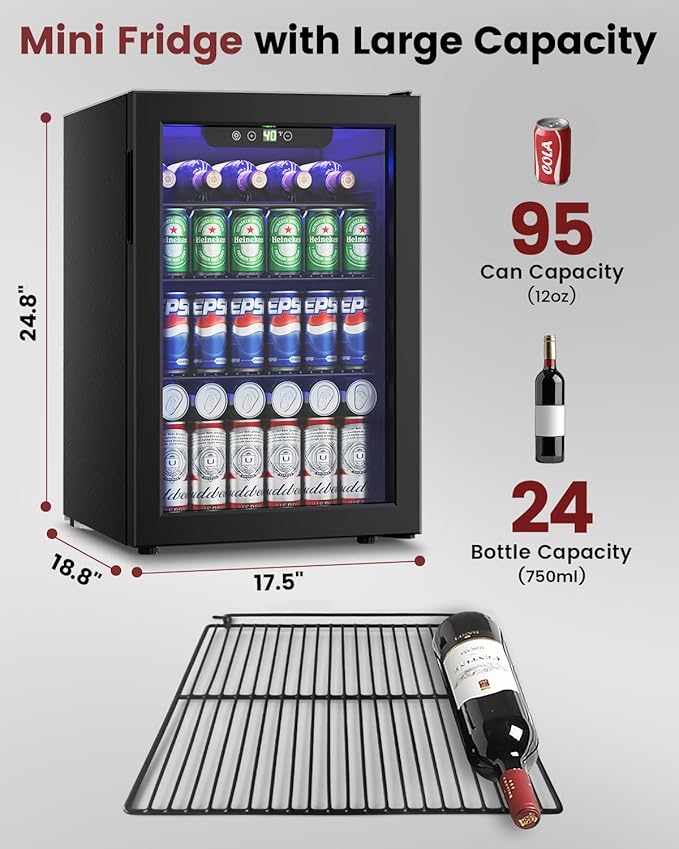 - Compact Size, Large Capacity - Our wine fridge is designed to fit anywhere with its compact size (17.5"W x 18.8"D x 24.8"H). Despite its compact footprint, this mini wine cooler holds up to 24 bottles of wine or 95 cans of beer or soda, making it an ideal choice for offices, dorms, apartments, home kitchens, and more. Customize your storage with 3 adjustable shelves to fit drinks of all sizes