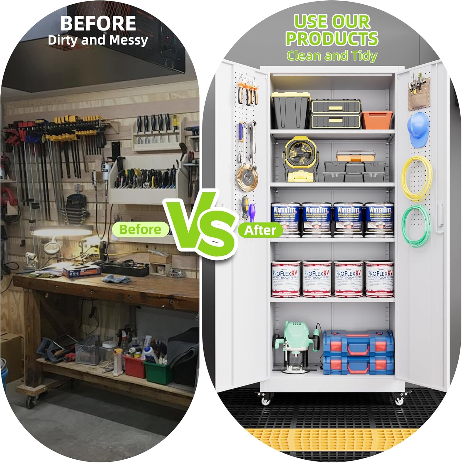 - ăGarage Storage CabinetăPlenty of storage. "great garage cleanup".You can move them around as needed and the casters and wheels work great on all the different surfaces inyour garage. Extra storage strong and fit your needs, it is sufficient for garage use.