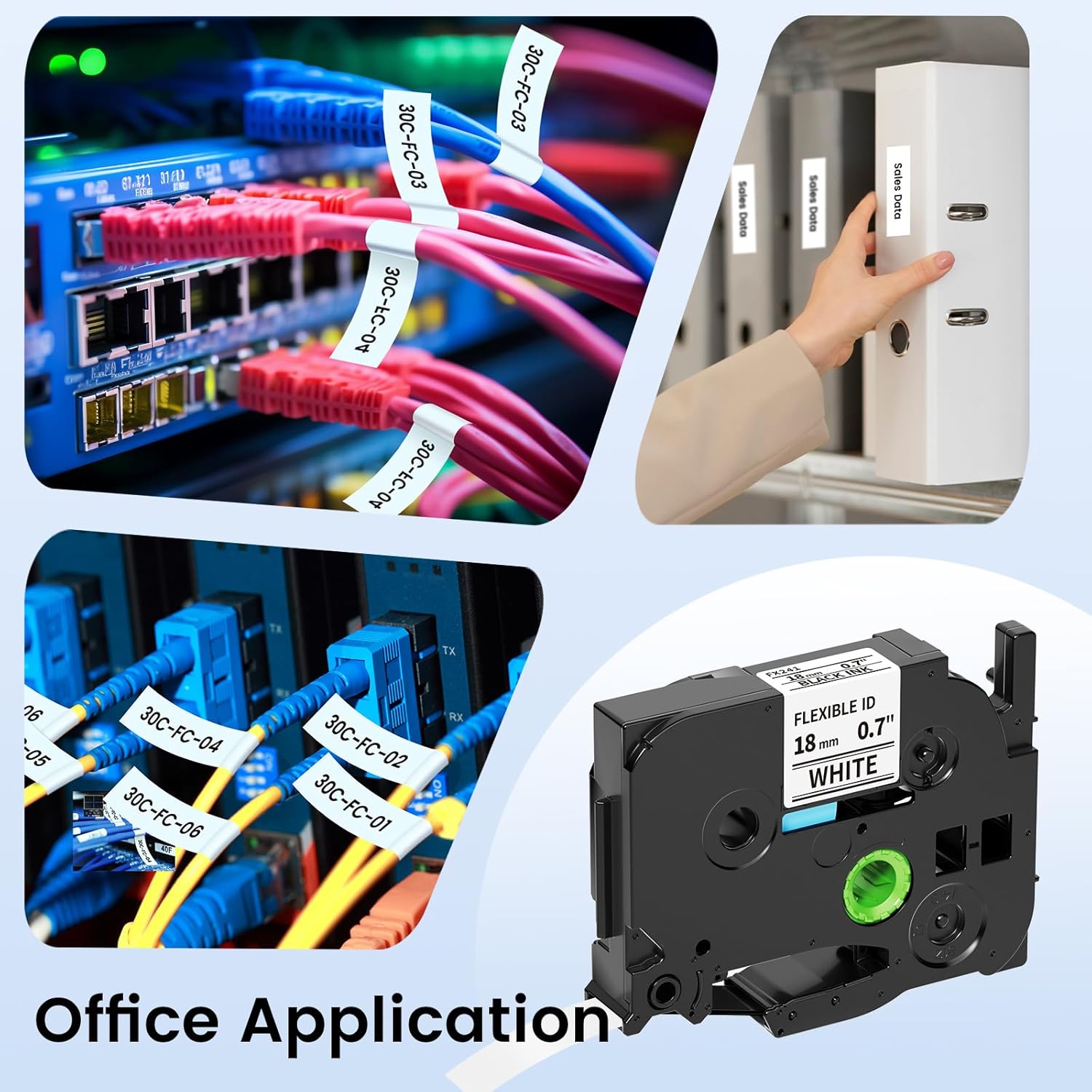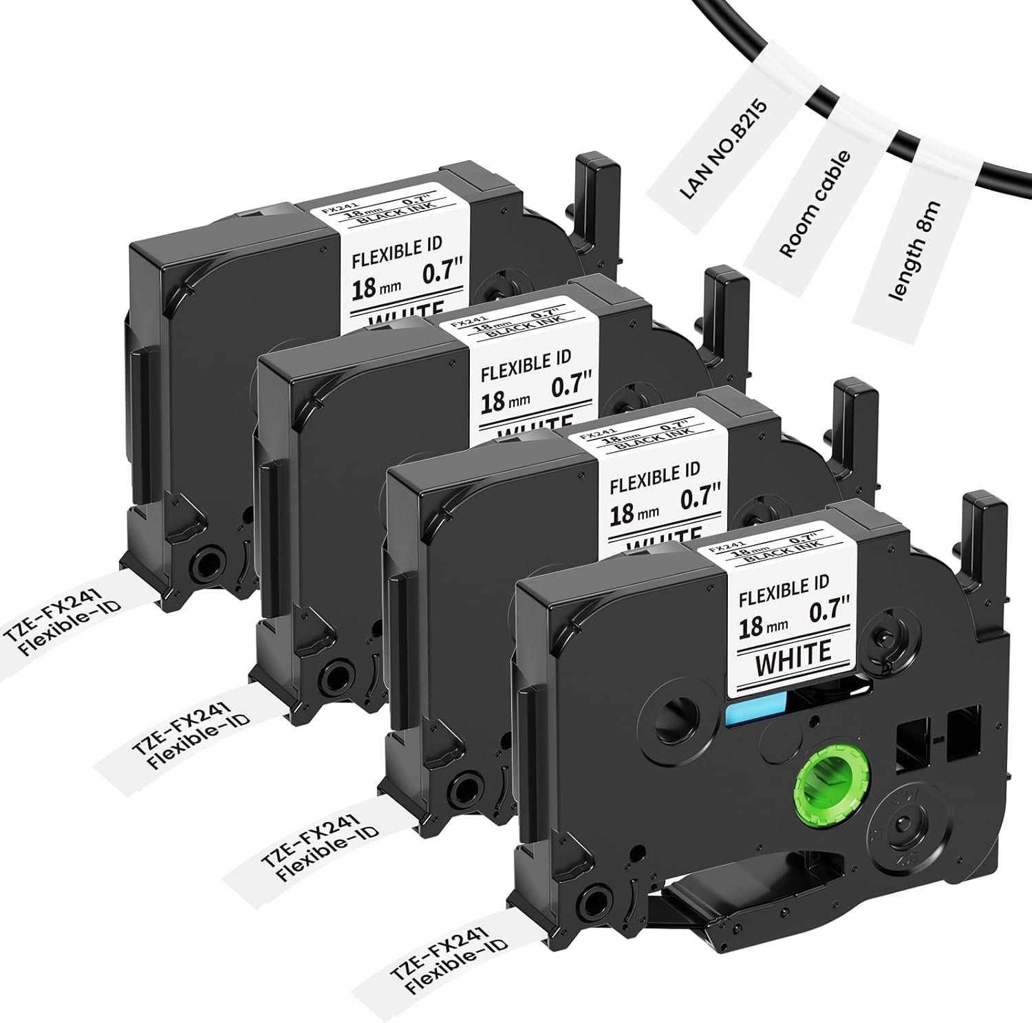 TZe-FX241 Flexible ID Laminated 18mm 0.7 Laminated White Cable Wire Labels Compatible with Brother P Touch for Wire Wrapping and Flagging, 26.2FT/8M for D400/D410/D600/Label Maker Tape, 4 pk