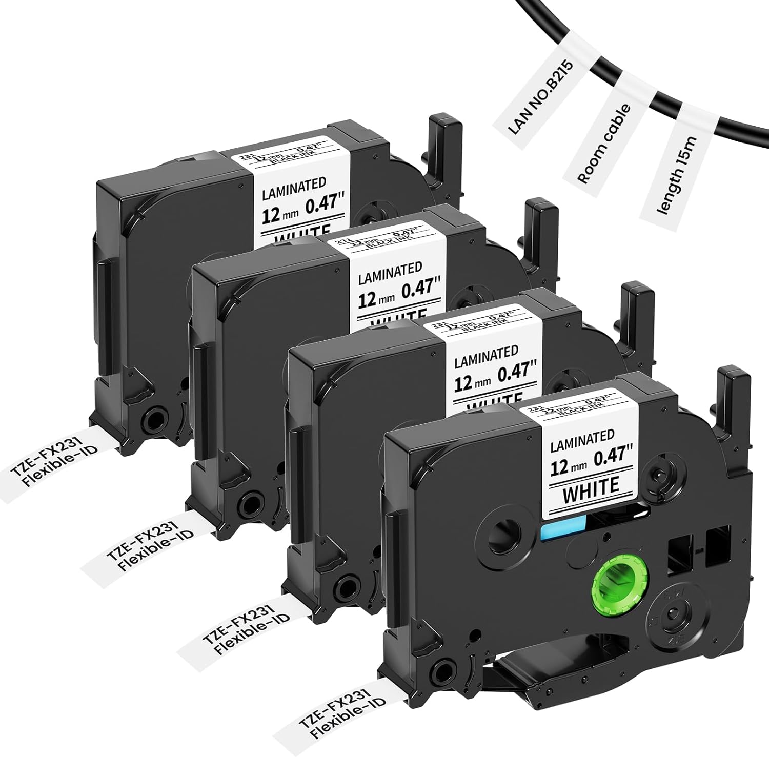 TZe-FX231 Flexible ID Laminated Cable Wire Labels 12mm 0.47 Laminated White Compatible with Brother P-Touch for Wire Wrapping and Flagging, 26.2FT/8M for PT-D210/D400/D600/H110 Label Makers
