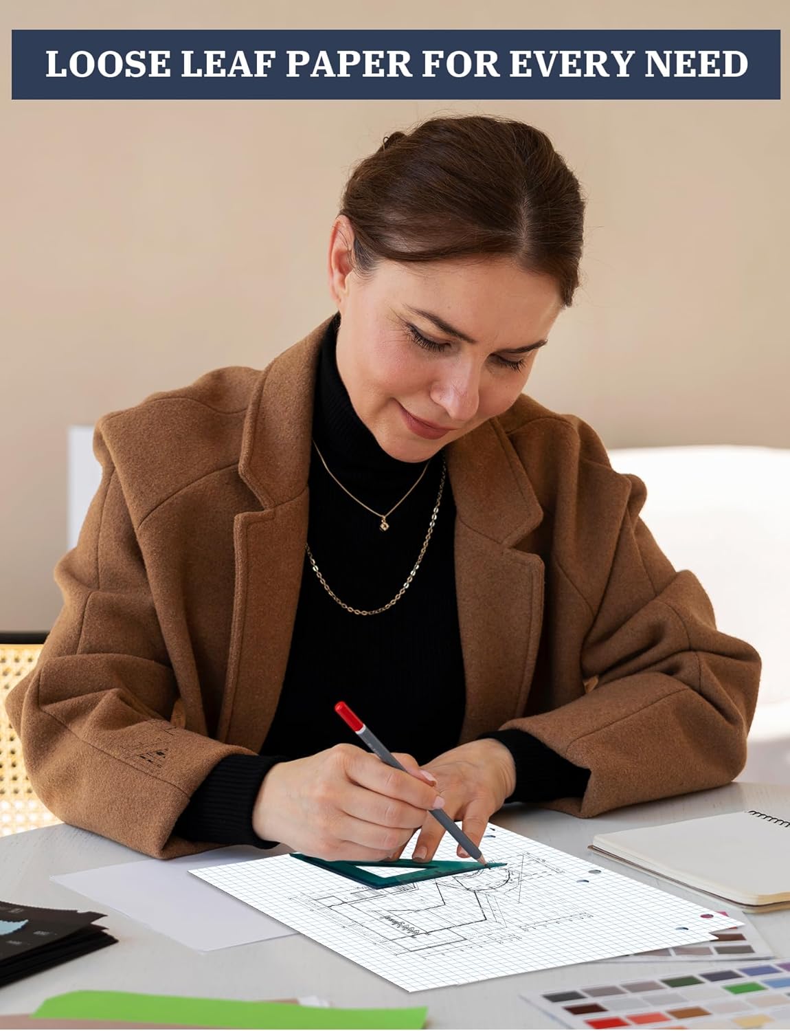 - 【Standard 3-Hold Punched】-- These binder paper 8 x 10-1/2 are equipped with standard 3-hold punched, It seamlessly fits into your binder, notebook or folder, making it easy to add, remove, or rearrange pages, Eliminate cluttered notes and maintain a neat, organized workspace. Featuring bulk, pre-punched 3-hole sheets in convenient rows, this graph paper loose leaf allows you to effortlessly remove individual pages, ensuring a tidy and organized workspace for maximum efficiency.