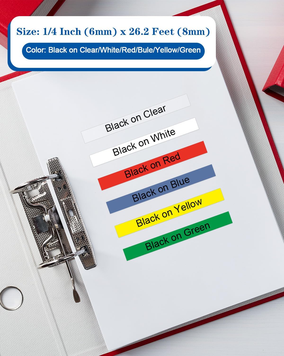 TZe TZ Tape 6mm 0.23" Laminated Colored Compatible for Brother P Touch TZe-211 TZe-111 Label Tape for PT-D210 D220 H110 D400 Label Maker, Black on White/Clear/Red/Blue/Yellow/Green, 1/4 Inch, 6-Pack