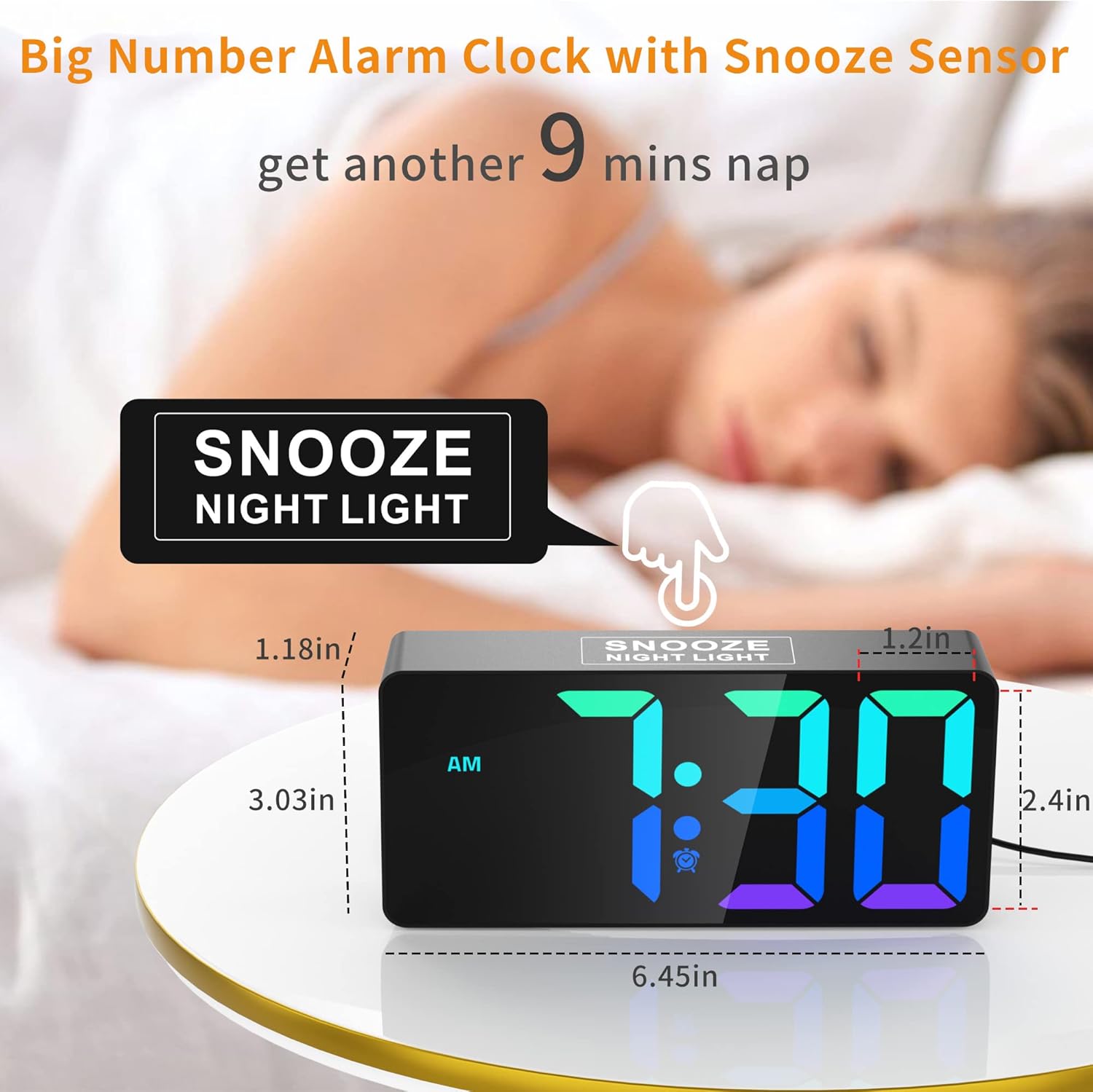 - 🌈【Dynamic RGB Alarm Clocks for Bedrooms】The dynamic colorful LED display feature makes this digital clock a unique addition for home living room decor. With the ability to cycle through multiple colors and change in real-time, it creates an eye-catching visual display that is sure to impress. The color ranges from Random Color-RGB Left to Right Flowing-RGB Top Downward Flowing-White-Red-Green-Blue to RGB Changing. Go and customize your mesmerizing visual experience.