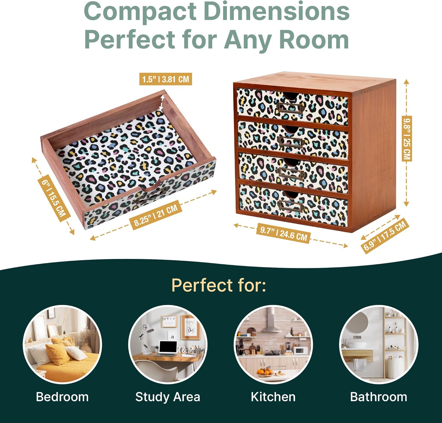 Colorful Leopard Print Wooden Desk Organizer - 4-Drawer Desktop Storage Cabinet for Office Supplies, Craft Tools & Home Organization - Trendy Wood Design for Crafters, Art Enthusiasts, Students