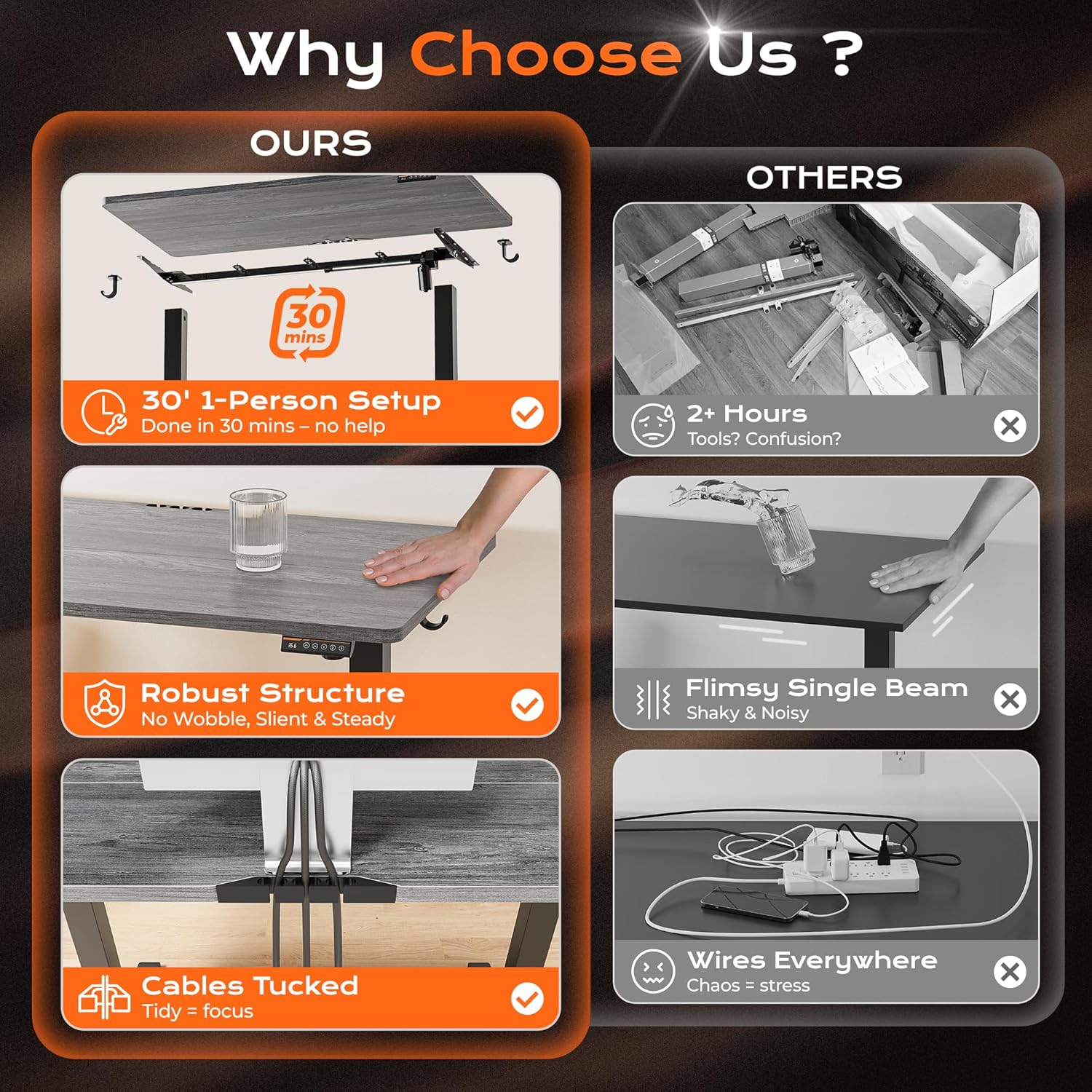 - ăWhisper-Quiet OperationăPowered by a robust yet quiet motor (operating at less than 45 DB), the wide deep desk brings smooth height adjustments without disturbing your household or office environment. This standup desk for home office is ideal for keeping focus and slient
