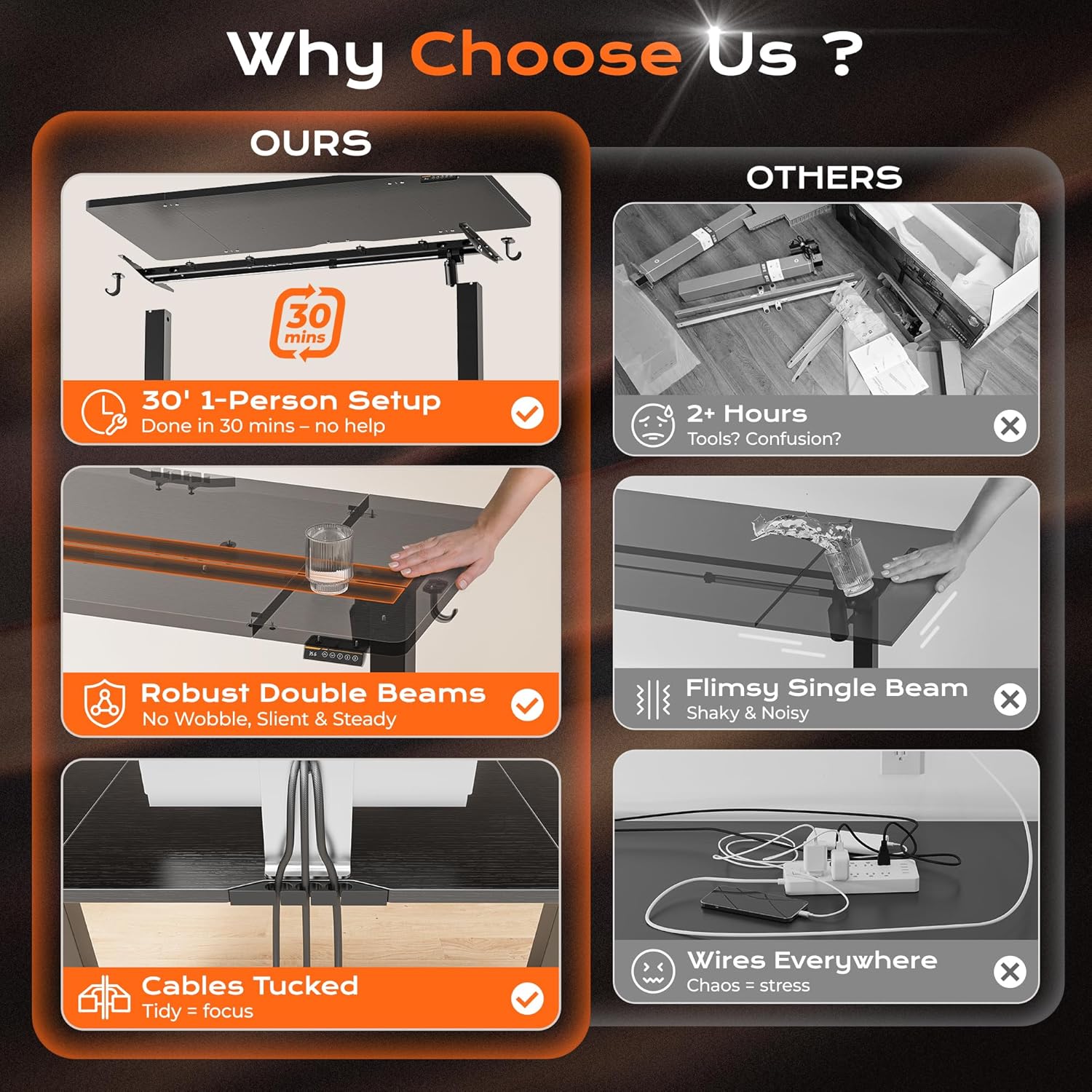 - ăWhisper-Quiet OperationăPowered by a robust yet quiet motor (operating at less than 45 DB), the wide deep desk brings smooth height adjustments without disturbing your household or office environment. This standup desk for home office is ideal for keeping focus and slient