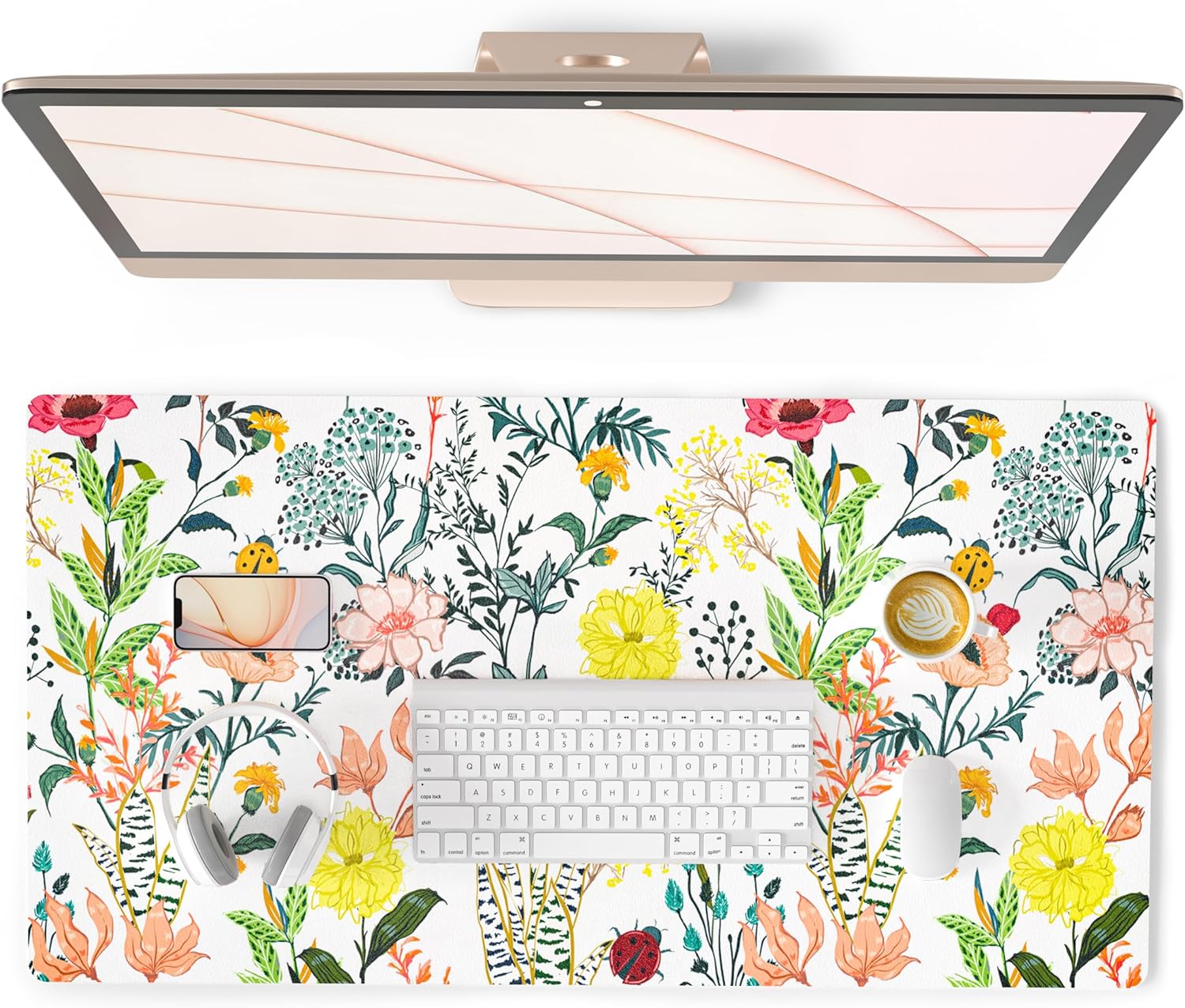 QIYI Floral Large Mouse Pad, Colorful Desk Mat for Desktop, Women Girls Desk Accessories Office Décor, PU Leather Waterproof Big Gaming Mousepad, Blooming Flowers Desk Pad Computer Mat, 31.5" x 15.7"
