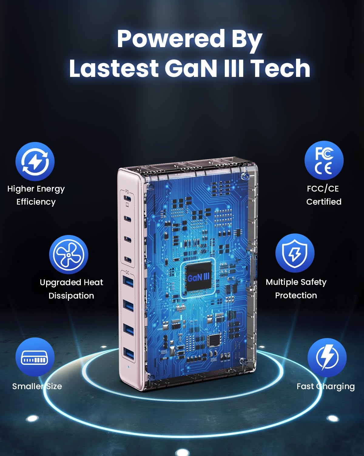 - ăGAN III Fast Charging StationăThe USB C charger adapted GaN3 generation chip technology, built-in multi-protection system and premium microchips. With higher energy efficiency, higher resistance to radiation and upgraded heat dissipation, Gallium Nitride (GaN) makes our chargers smaller and safer without sacrificing a drop of power.