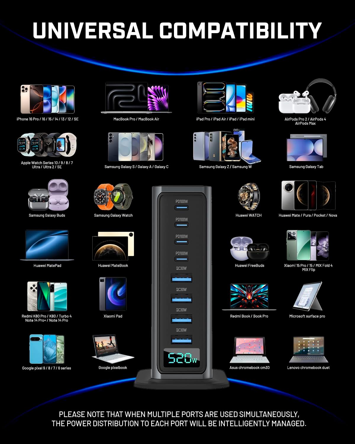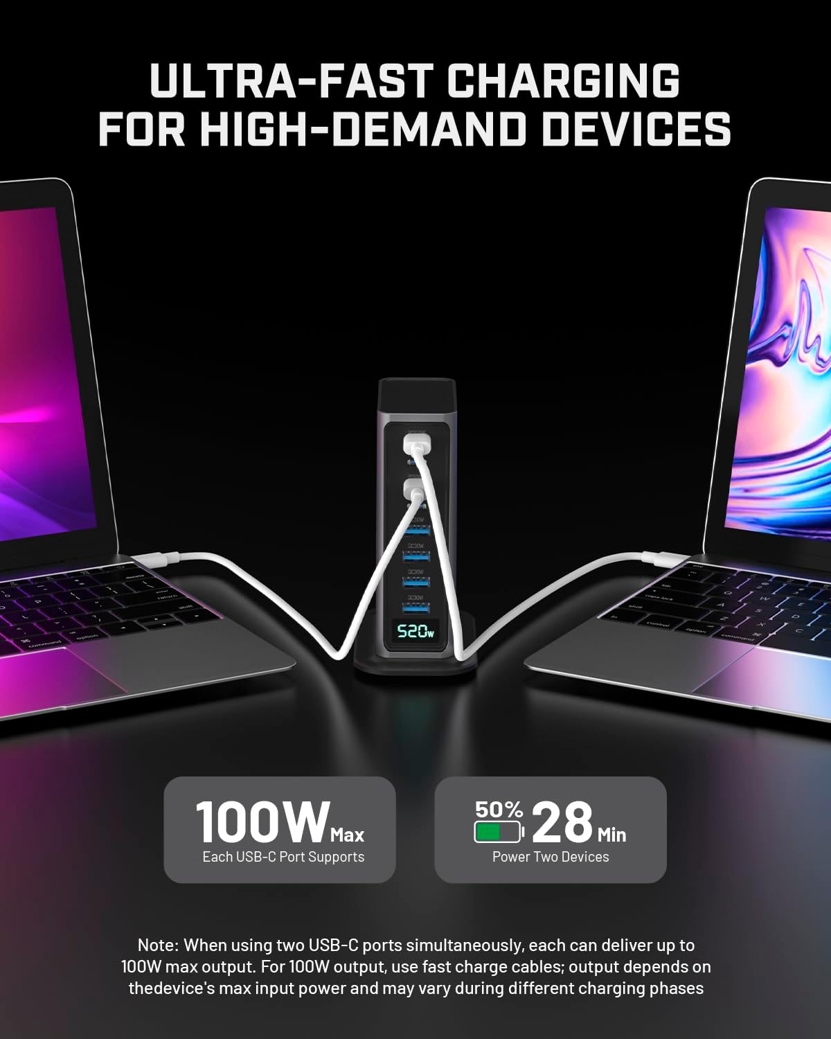 - ă520w Super Power 8-in-1 Fast Charging StationăNo need to wait, quickly charge your computer, mobile phone, watch, headphones, fans and etc 8 devices at the same time. For example, you can charge four 14-inch MacBook Pros to 50% power in 28 minutes. Supports maximum output of 100 watts, which can reduce the burden of accessories, improve charging efficiency, and save your money and time.