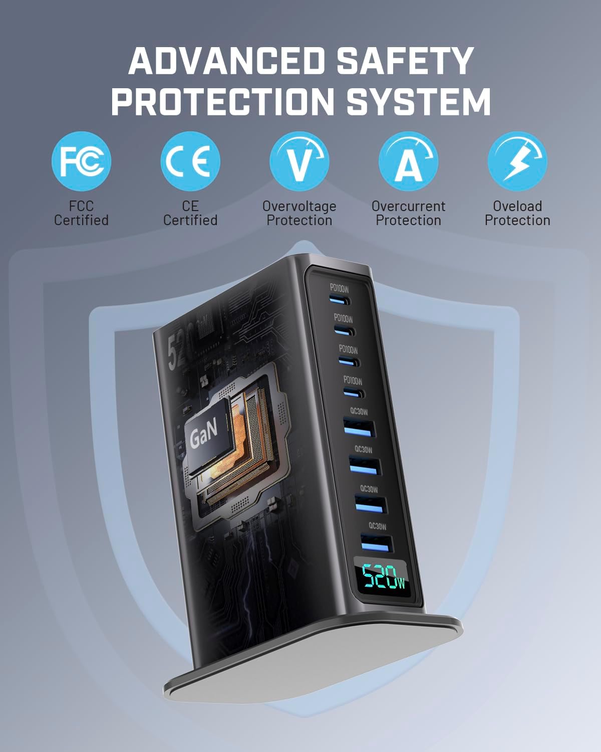 520W USB C Charger Block, 8 Ports GaN Fast Charging Station Hub, PD 100w Type C & USB A Laptop Desktop Charger Adapter for MacBook Air/Pro, DELL, iPhone, iPad, Samsung, Travel Home Office Use
