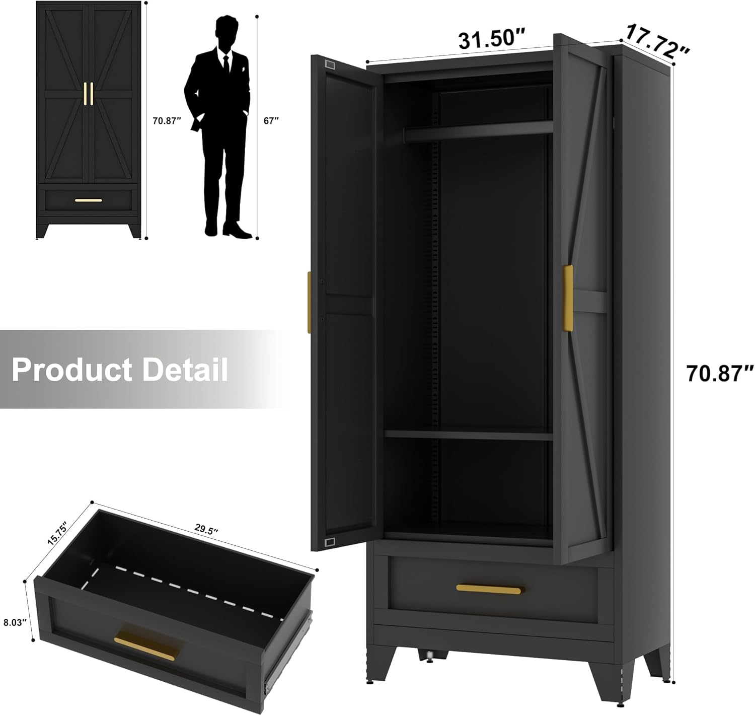 Metal Wardrobe Cabinet,71 Armoire Wardrobe Closet with Drawers and Hanging Rod,Metal Armoire with Adjustable Shelves for Closet,Bedroom,Farmhouse Storage Cabinet with Drawer(Black)
