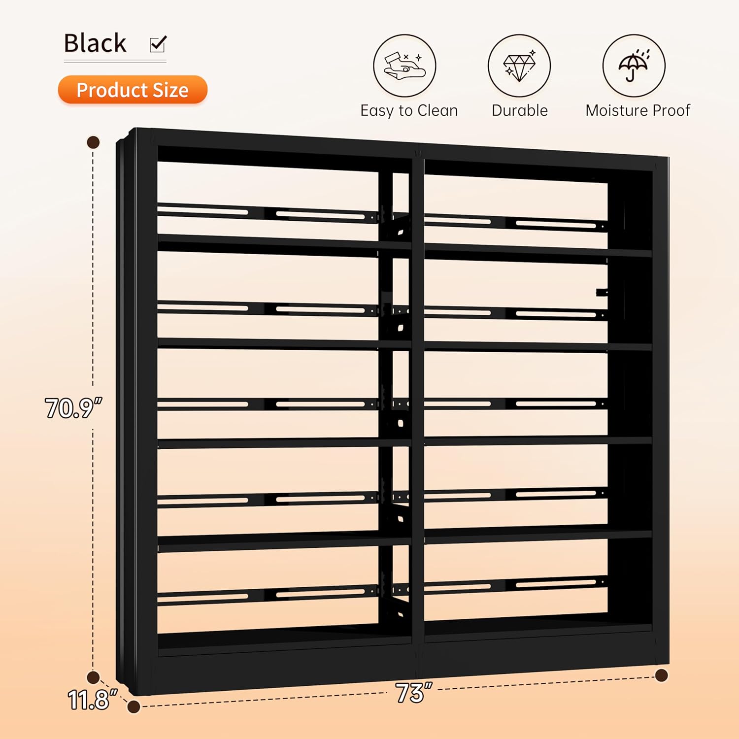 - ADJUSTABLE SHELVES: The bookshelves metal with a popular size: 11.8"D x 73"W x 70.9"H. This black bookcase is equipped with adjustable shelves with special clasps on both sides, allowing you to adjust the height of the tiers according to different storage needs. This innovative design not only simplifies the installation and adjustment process of the bookshelves for living room, but also greatly enhances its versatility and ease of use. Whether used in a library, office, living room, or study, the bookshelves and bookcases blends perfectly into any environment, providing you with an ideal place to display and store books, decorative objects and other daily items
