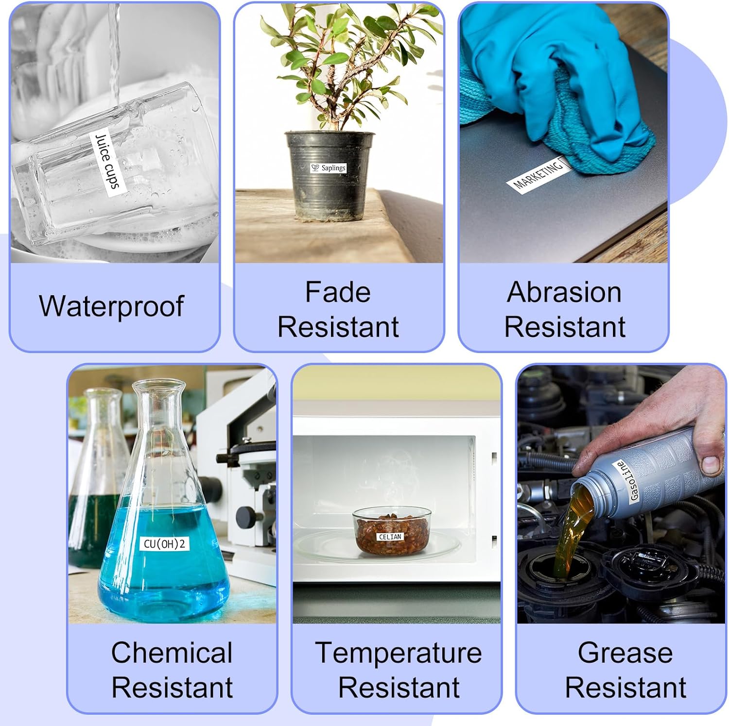 - Upgraded Technology: Thermal printing technology. Designed to stick to almost all clean, dry, flat surface for durability even under harsh conditions. Water-resistant, fading-resistant, abrasion-resistant, chemical-resistant, higher or lower temperature-resistant as well as grease-resistant, exposure to sunlight without fading or peeling.
