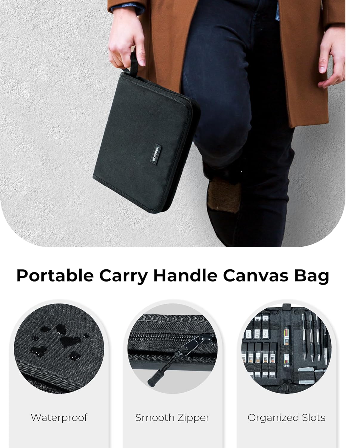 - [Canvas Art Kit for Artist] Made with quality waterproof canvas that resists tearing. Each accessory can be stored in its own dedicated slot for neat and organized storage. The handle design makes it easy to carry for outdoor sketching and painting