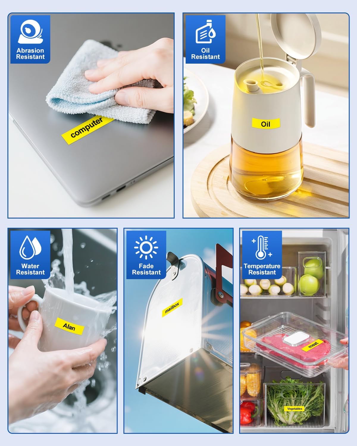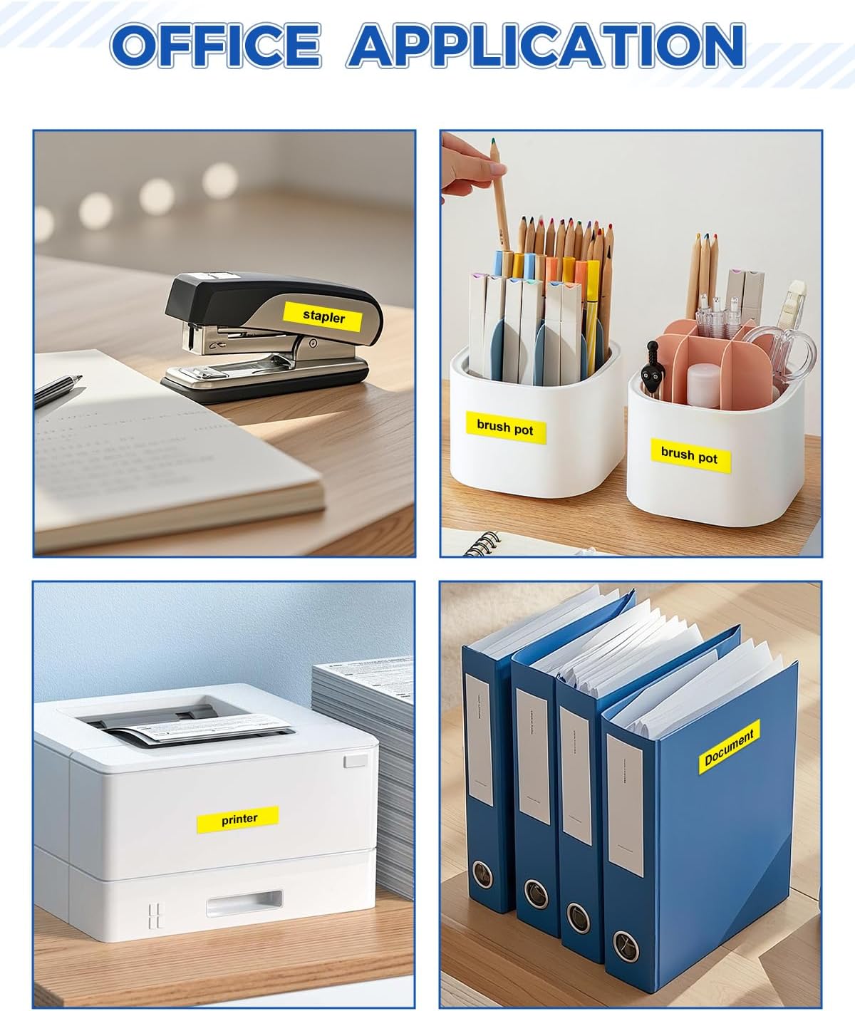 - Features: Our 12mm 0.47" yellow label maker tape split design makes the label tape easy to peel and apply, with strong adhesion/waterproof/temperature/oil/abrasion/fading, and reliably sticking to various surfaces
