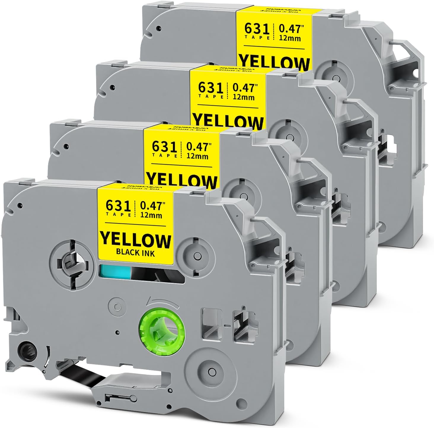 Tze631 12mm 0.47" Laminated Yellow Tape Compatible for Brother Tze-631 Tz-631 P Touch Tz Tze Label Tape 12mm 1/2" Black on Yellow for PTD210 PTD220 PTD400 PTD600 PTD610BT Label Maker, 4-Pack