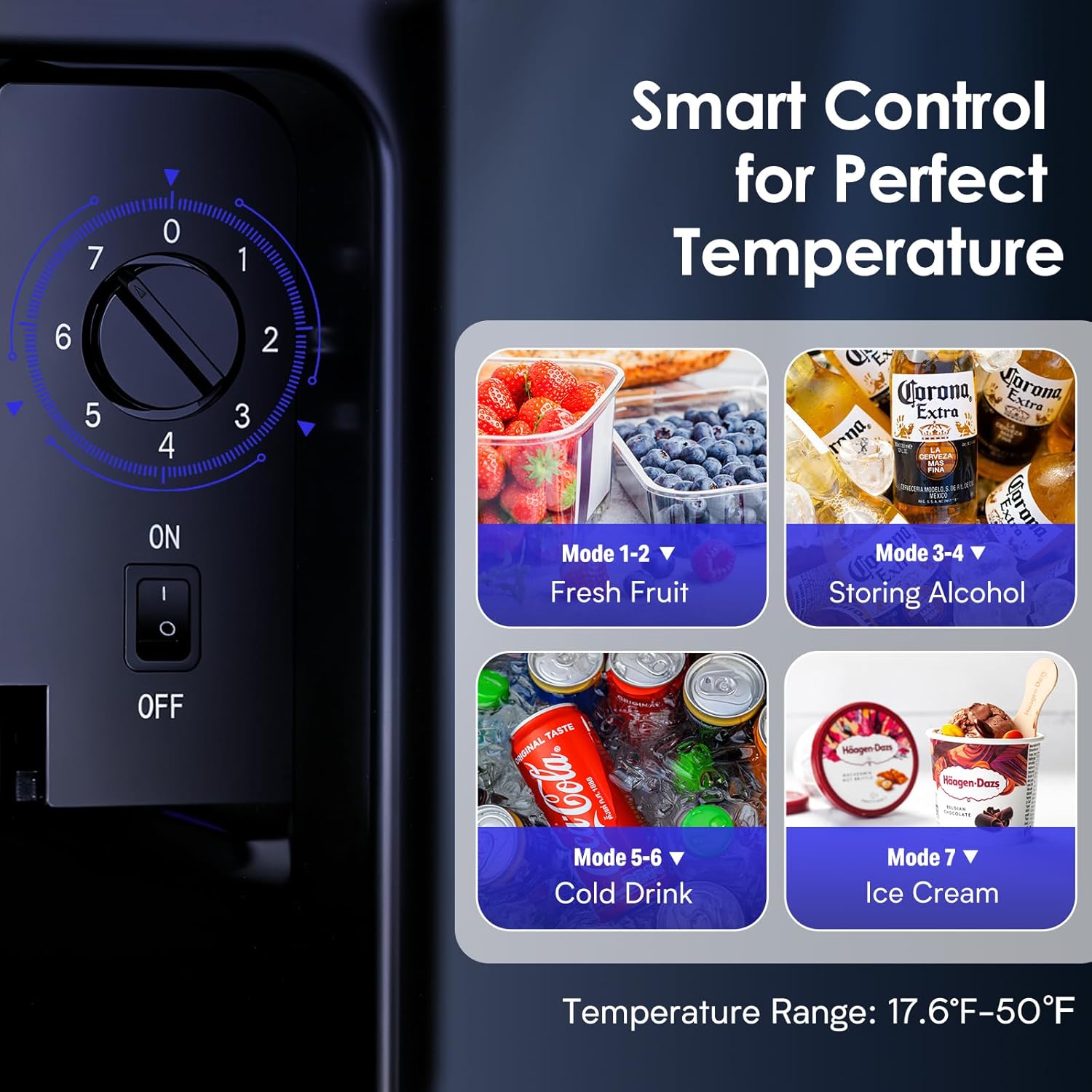 - Advanced Temperature System: Equipped with a powerful compressor and fan circulation system, this beverage cooler ensures even cooling throughout the entire beverage fridge. The quiet operation won’t disrupt your daily life, making the small fridge a perfect addition to any room. With 7 adjustable temperature settings, you can keep your drinks perfectly chilled between 41°F and 50°F, or maintain frozen items in the freezer compartment from 17.6°F to 32°F, suitable for all your beverage needs.