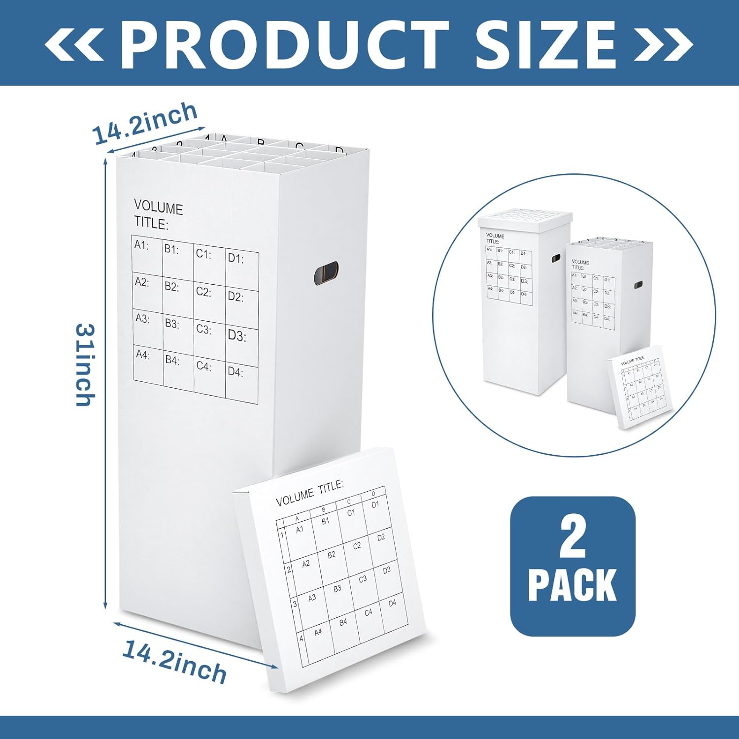 - 32 Slots : you will get 2 cardboard file boxes with lids, each measuring about 14.2 x 14.2 x 31 inches, each box is designed 4 x 4 with 16 slots , each slot is approx. 3.54 x 3.54 inches, and can store items up to 31 inches high