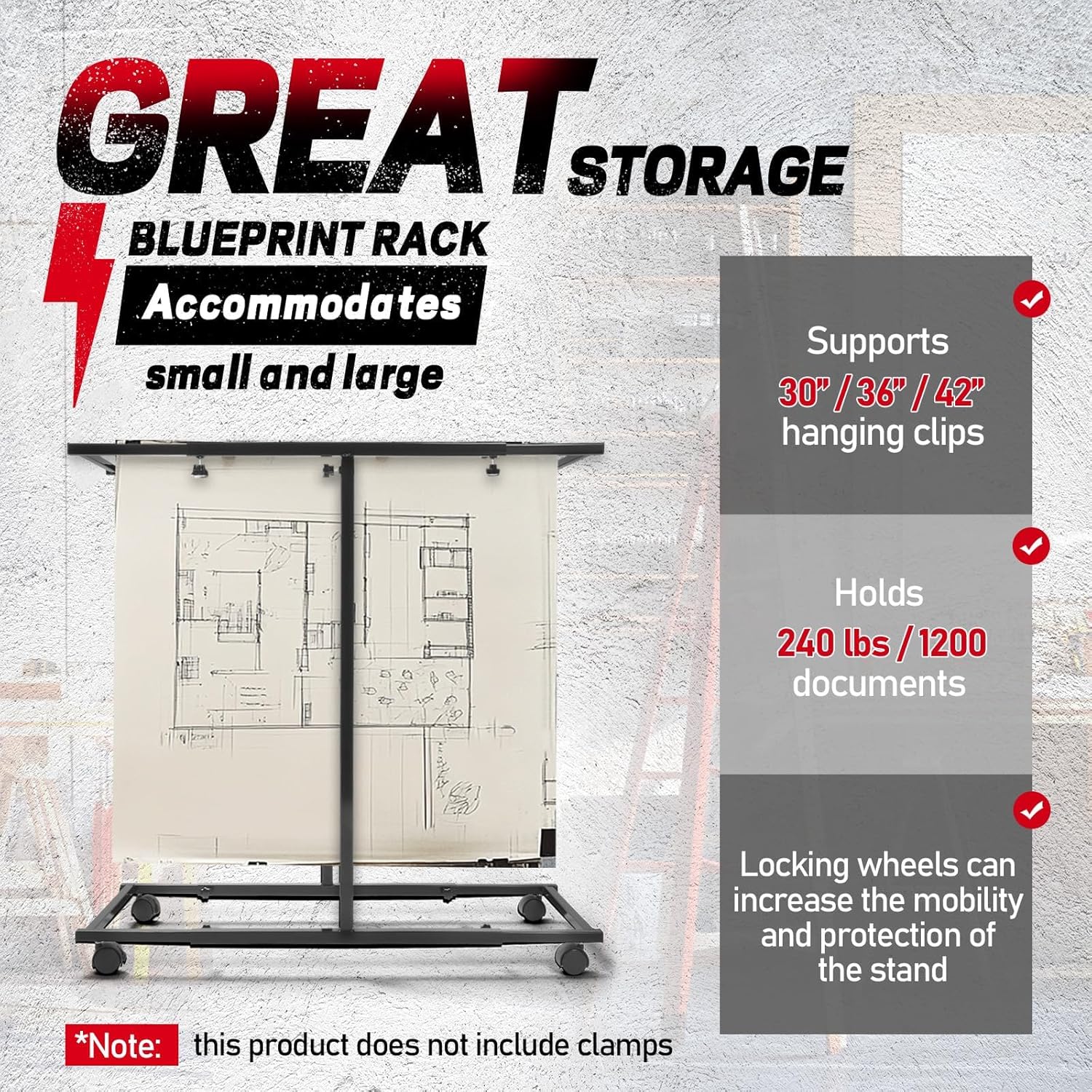 - Adjustable Designs: The blueprint holder is designed to accommodate people of all heights with its adjustable height and length. It supports 30", 36", 42" hanging clamps and holds a variety of file sizes. The base is equipped with 4 swivel casters to make transporting blueprints easier