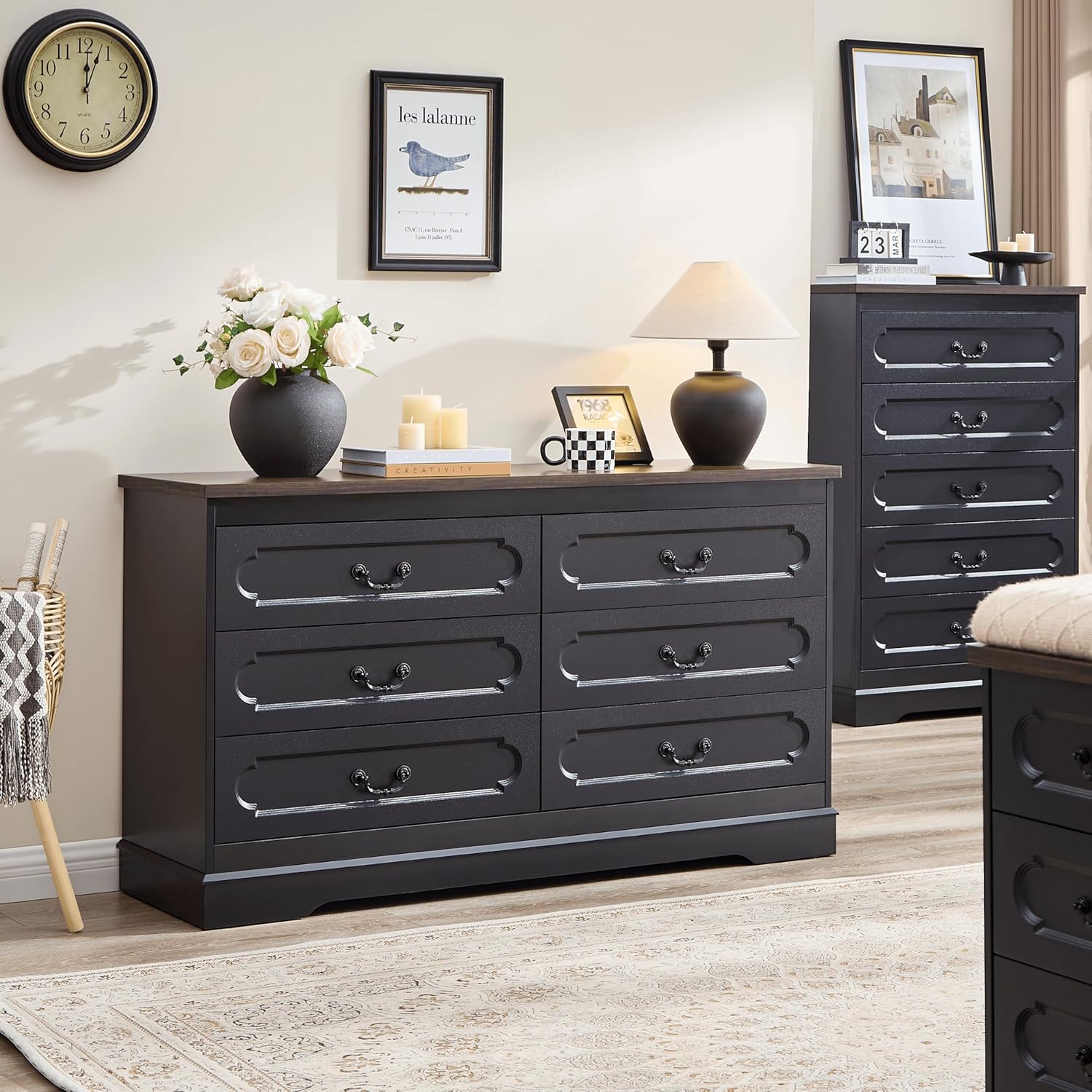 LIDYUK 6 Drawer Dresser for Bedroom Farmhouse Black Tall Wood Chest of Drawers for Bedroom Dresser, Modern Rustic 55" Wide Drawers Dressers Wooden Closet and Storage Cabinet, Hallway, Living Room
