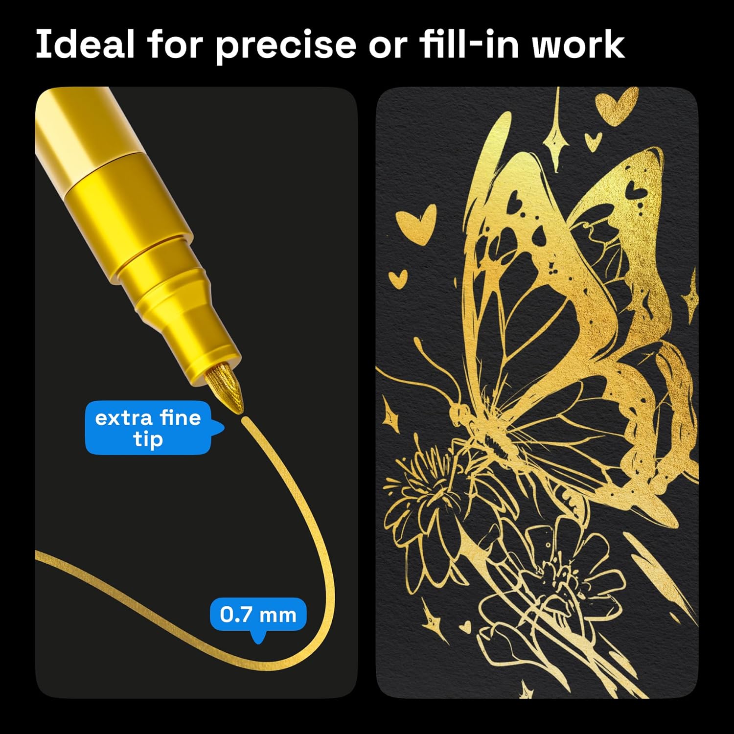 - 0.7 mm Extra Fine Tip: Each metallic gold paint pen comes with an extra-fine 0.7mm nib for precise detailing. Ideal for small lettering, touch-ups, outlines, and accents, these gold pens are perfect for fine art, crafts, and DIY projects.