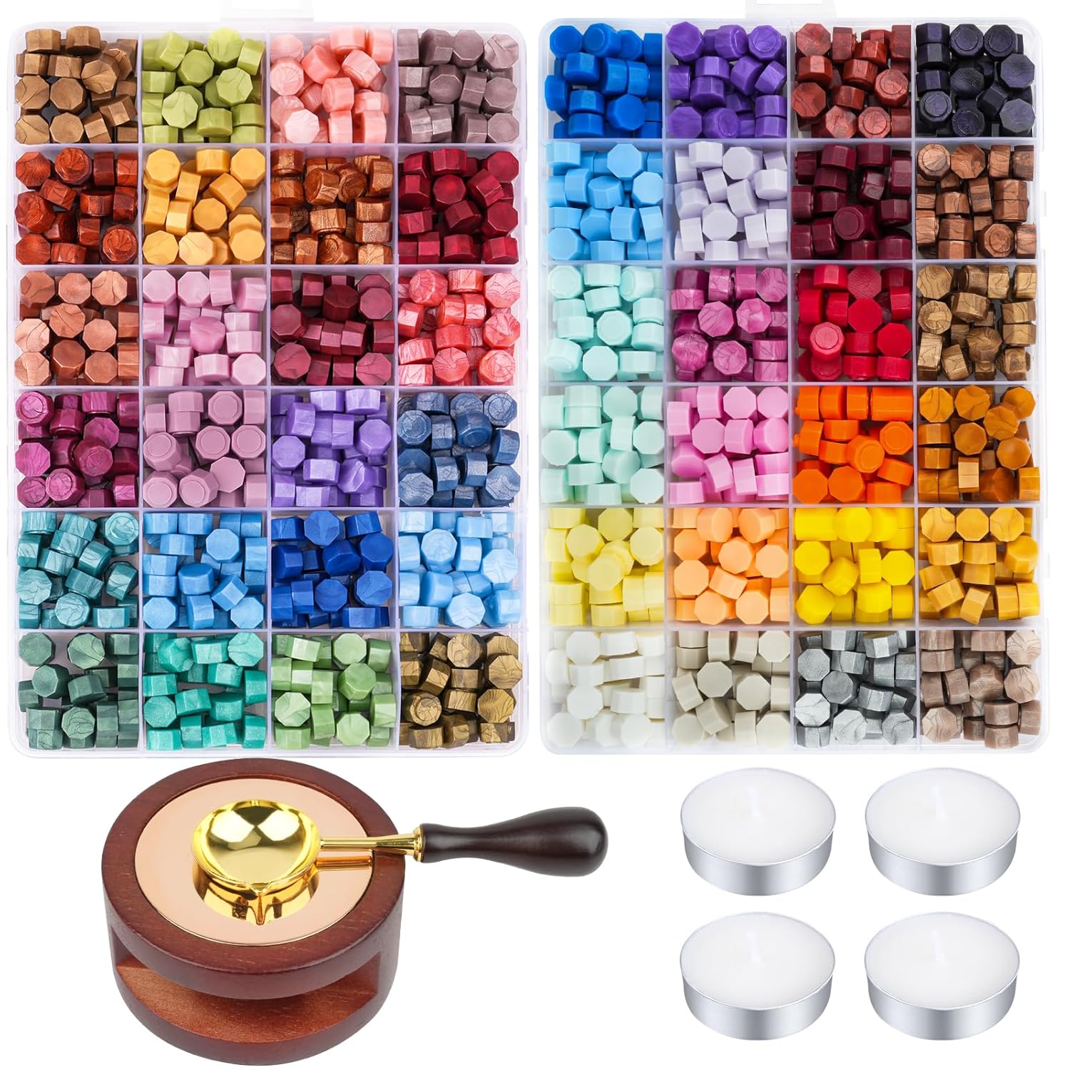 - đăPackage IncludedăYou will receive 48 colors 1248 pcs sealing wax beads (about 26 pieces for each color), 1 pack melting pot, 1 pack wax melting spoon and 4 packs tea light candles. So many different colors wax seal beads will satisfy many of your creative needs for wax stamps.