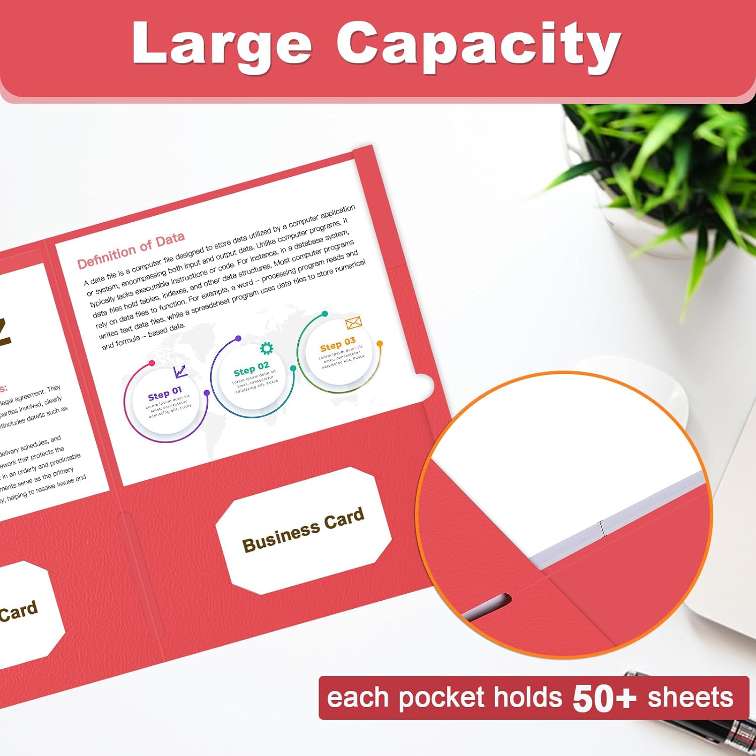 - Large Capacity: 30 pack pocket folder has two deep pockets that hold over 50 sheets of paper each. 2 business card slots for instant access to important contacts without the need for a separate business card holder.