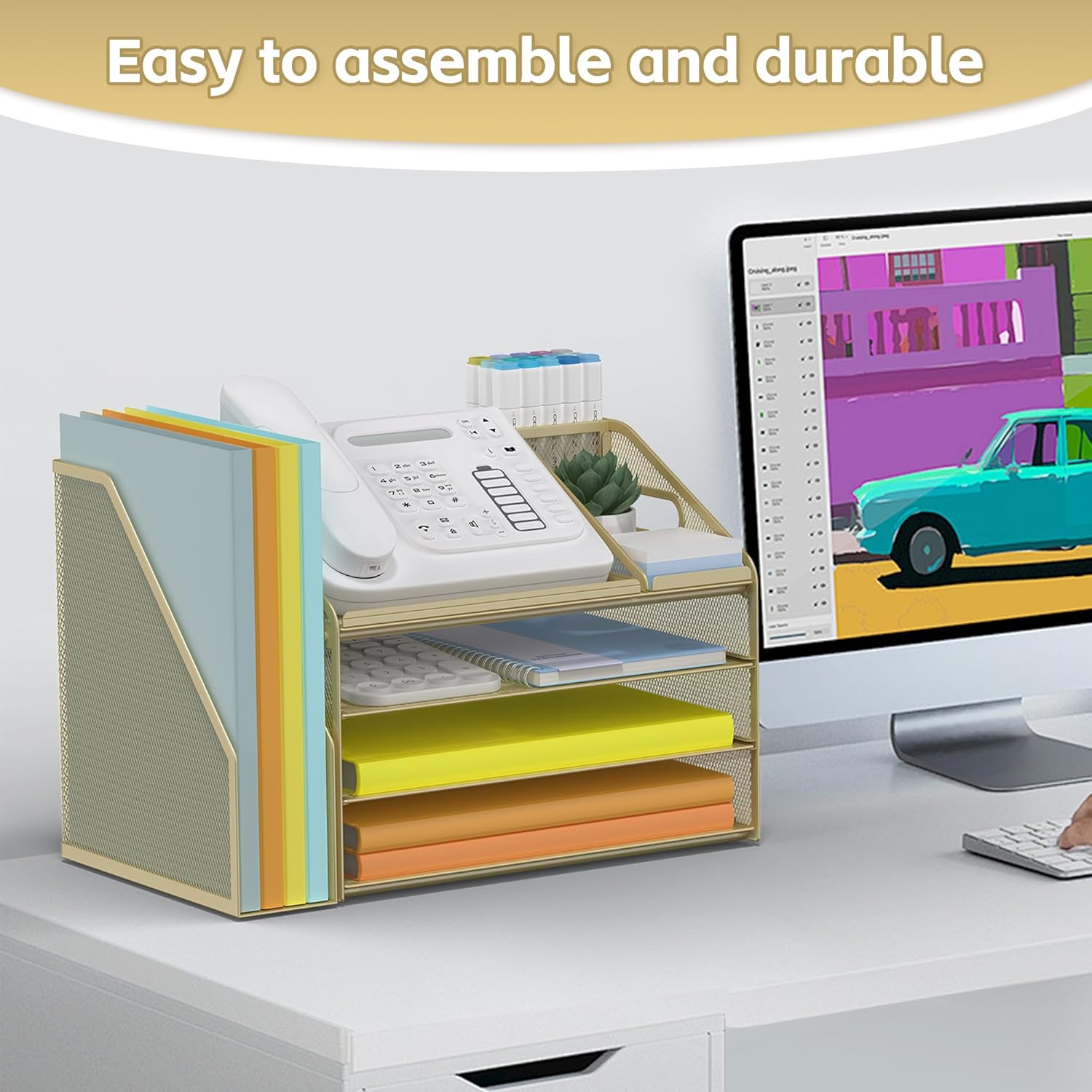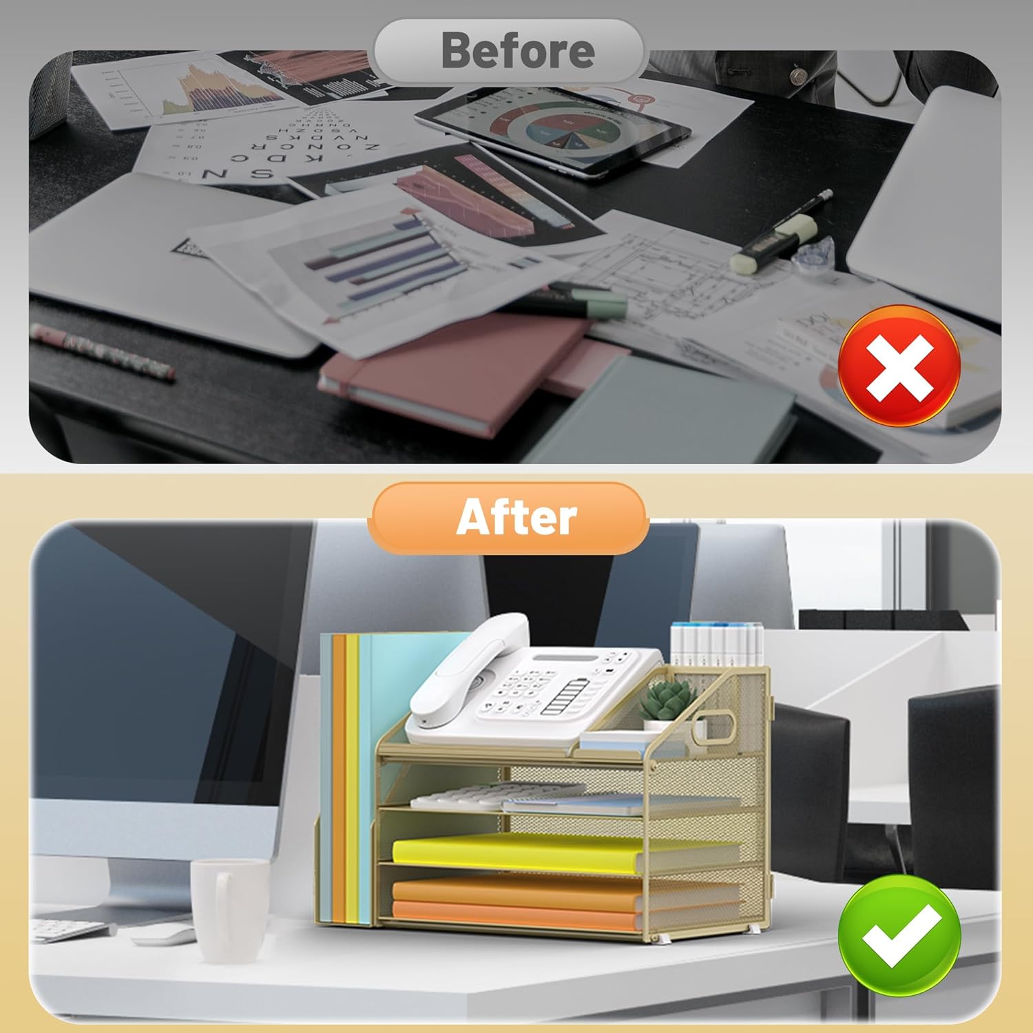 - 4 Tier Organization with Pen Holder: This Gold Yellow desk organizer boasts a 4-tier design for efficient sorting of your papers, letters, and other office supplies, along with a dedicated pen holder. It's perfect for maintaining a tidy and uncluttered workspace. The desk file organizer is an essential desk accessory that contributes to an orderly and professional atmosphere
