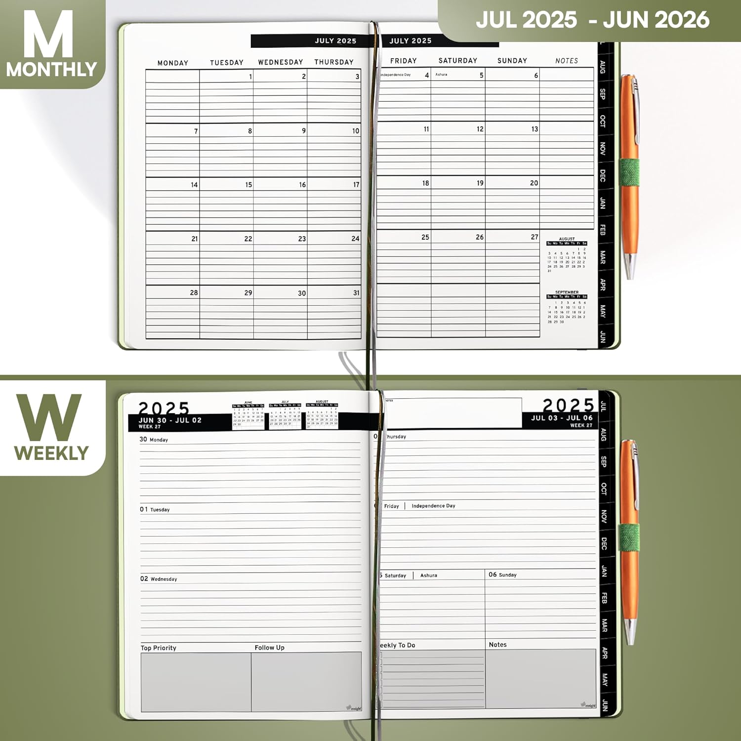 Ensight 2025-2026 HARDCOVER Leather Planner Weekly & Monthly - 6.5x8.5 Inches - Academic Planner Business Personal or Student - Pen Holder, Thick Paper, July 2025 - June 2026 (Olive Green)