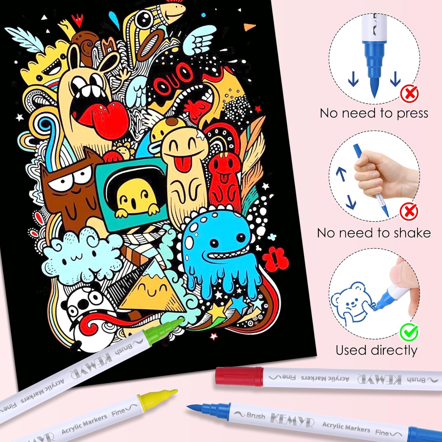 - Dual Tip Acrylic Paint Pens----Each KEMYR pen is equipped with a 1 mm fine tip for lines and details work, and a 1 - 5 mm brush tip for filling large areas and coloring. By changing the brush pressure, you can create different strokes, saving the trouble of changing tips.