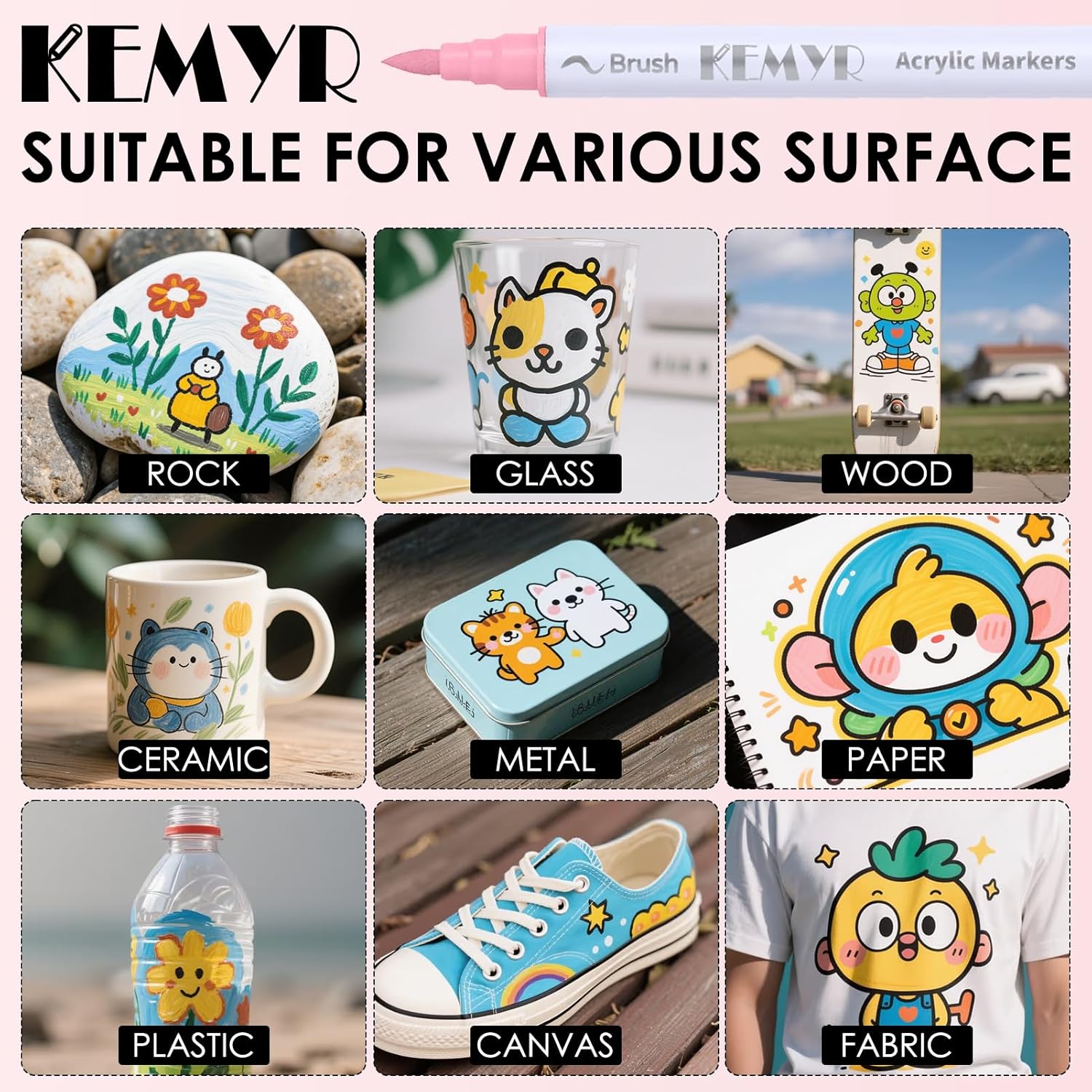- Widely Used----Acrylic paint marker set suitable for rock painting, ceramic, wood, fabric, stone, metal, plastic, canvas, resin, shoe, egg, calligraphy, scrapbook, paper, sneaker, clothes, models, leather, porcelain, dishwasher, posters, epoxy, brush lettering, mug painting, glass paints for glass painting, Christmas ornament, Halloween pumpkin painting, enjoy creating DIY art crafts graffiti projects on a variety of surfaces. These water-based markers provide consistent, fade-resistant, Waterproof and anti shedding.