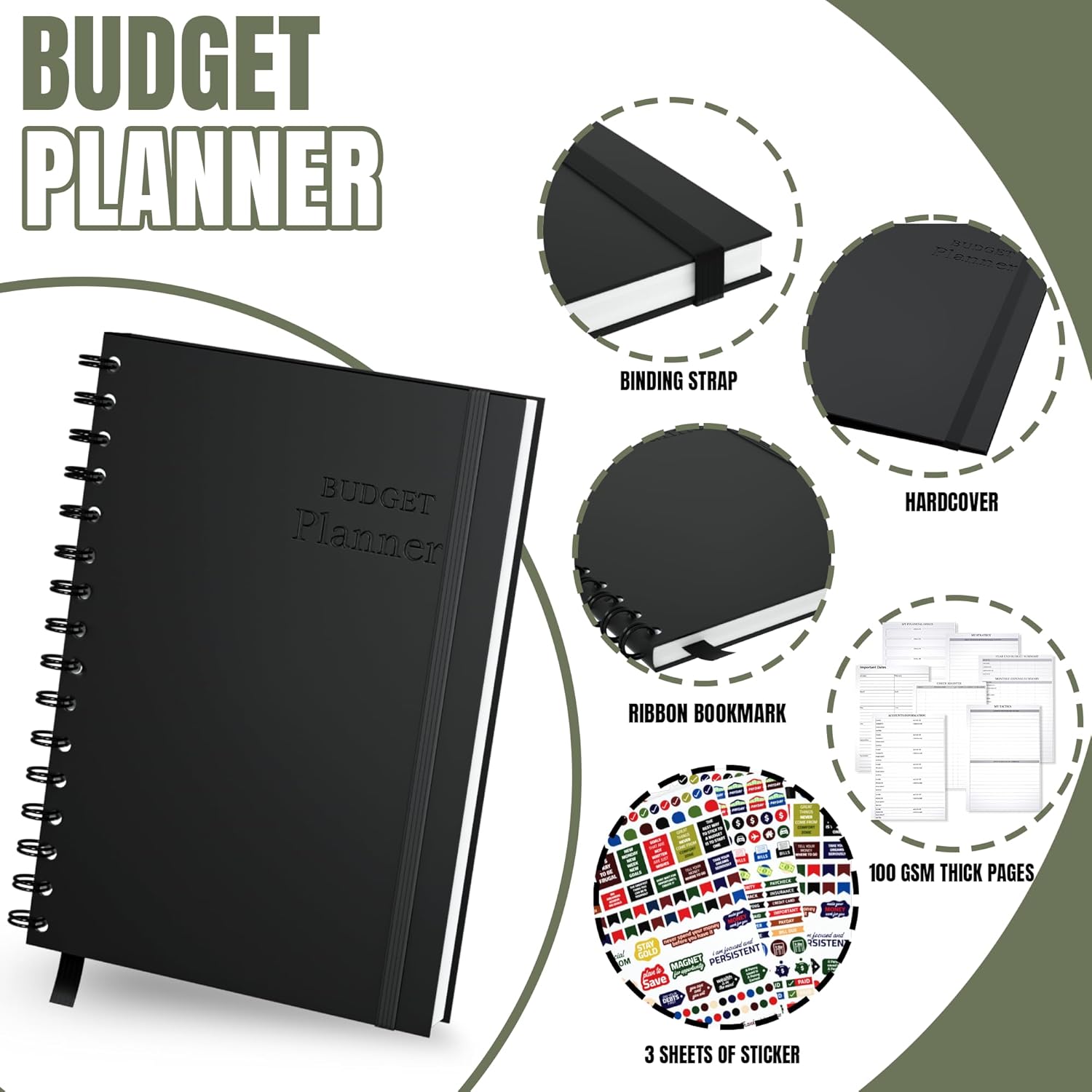 - A5 Hardcover Budget Journal With Premium Features – Includes elastic band, ribbon bookmark, 3 sticker sheets, and durable 100gsm paper. This weekly and monthly budget planner is ideal for planning at home, work, or on the go.
