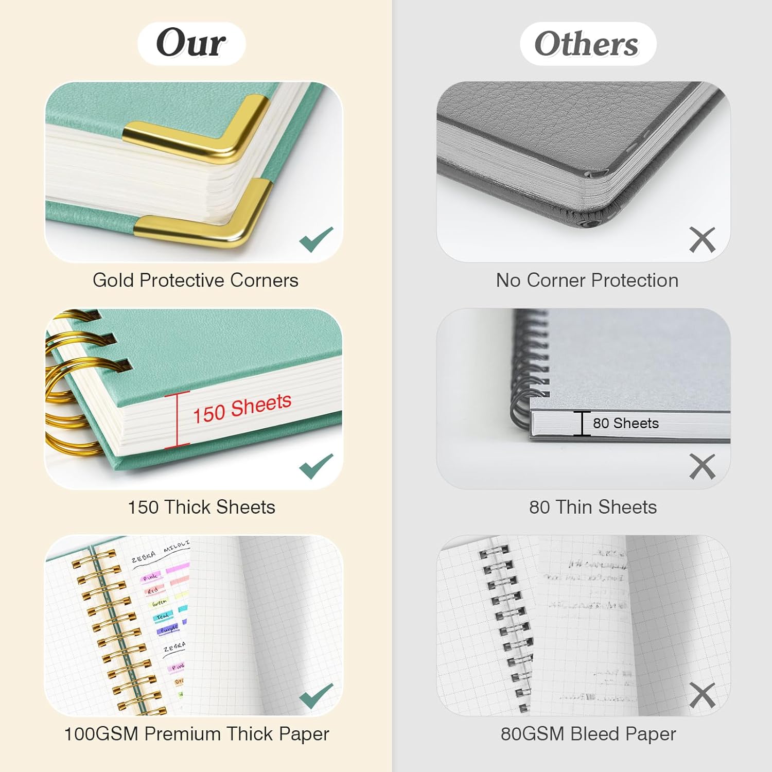 • 【Premium Leather Cover & Strong Binding】Spiral notebook showcases a luxurious leather hard cover, complete with golden corner protectors for extra durability. Its professional design not only looks stylish but is built to last. The strong metal double spiral binding allows for a full 360° lay-flat design, making writing more comfortable and efficient. Whether flipping through or laying the Subject notebook flat, this design guarantees a smooth writing experience.